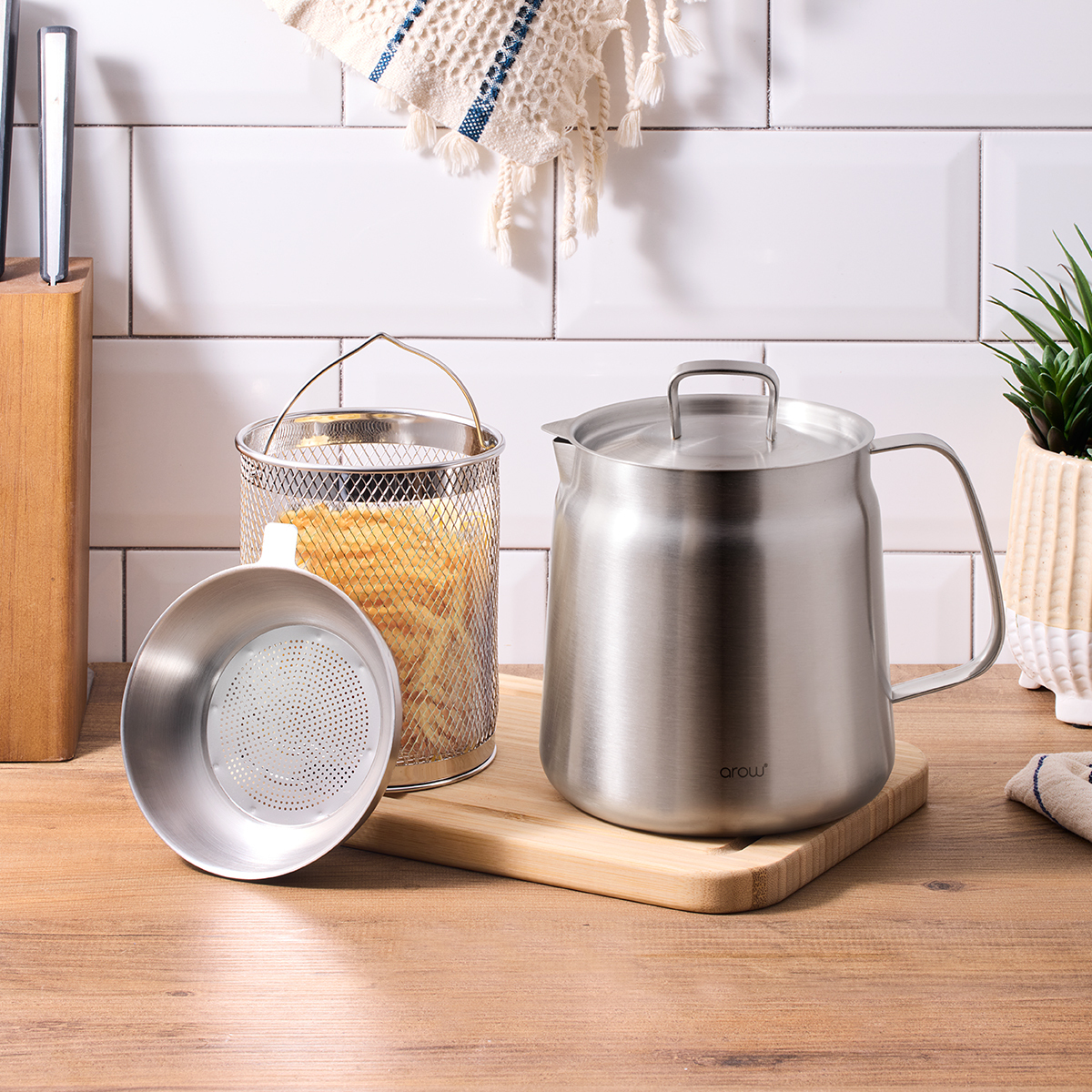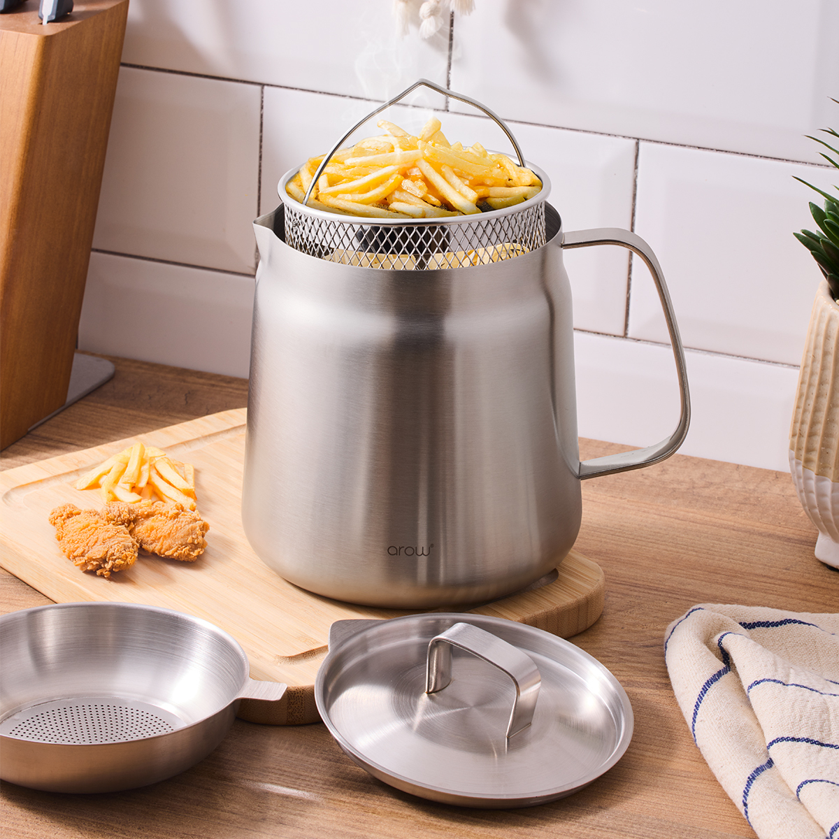 Potun üstünde durabilen süzgeç tasarımıyla kızartmanın yağını kolayca süzebilirsiniz.