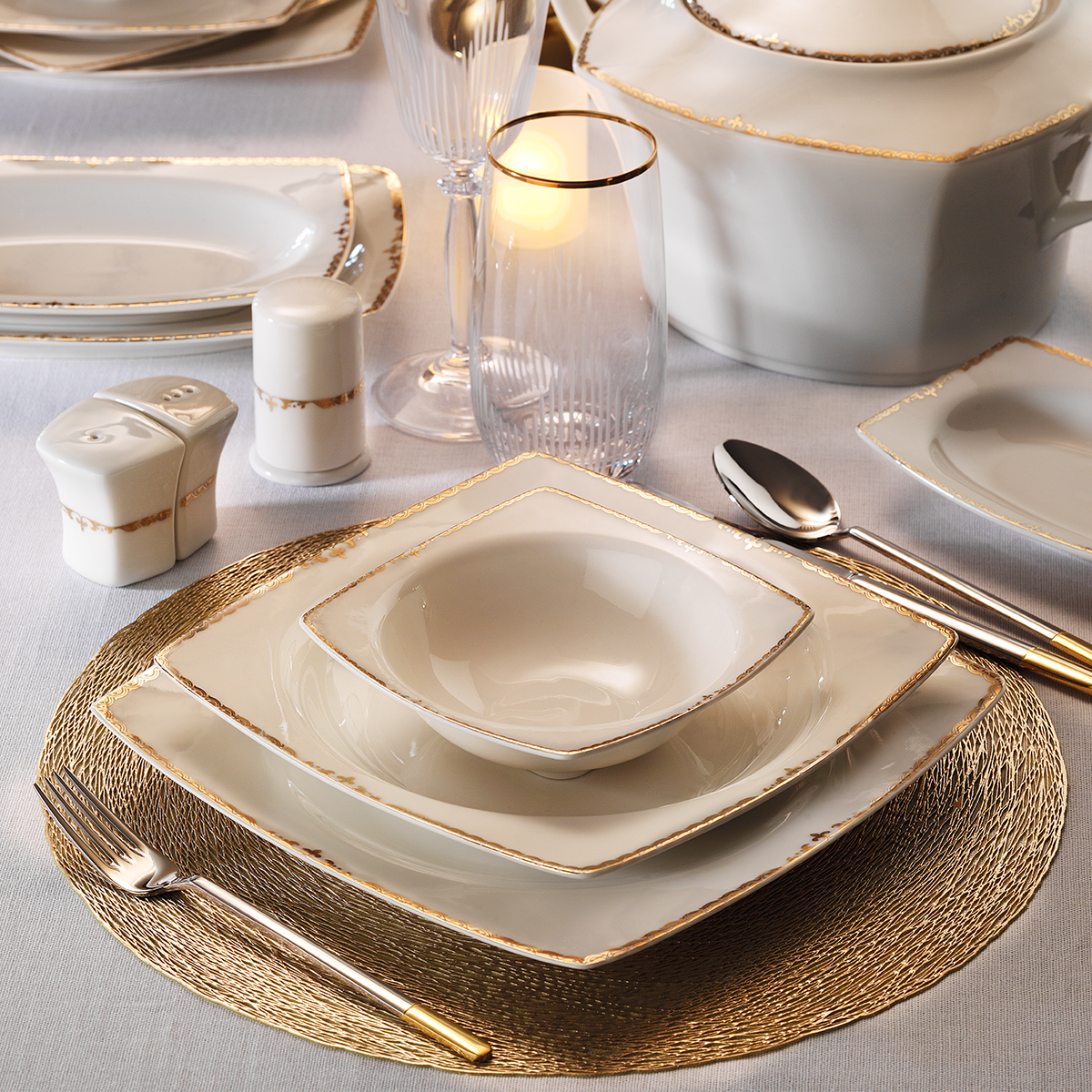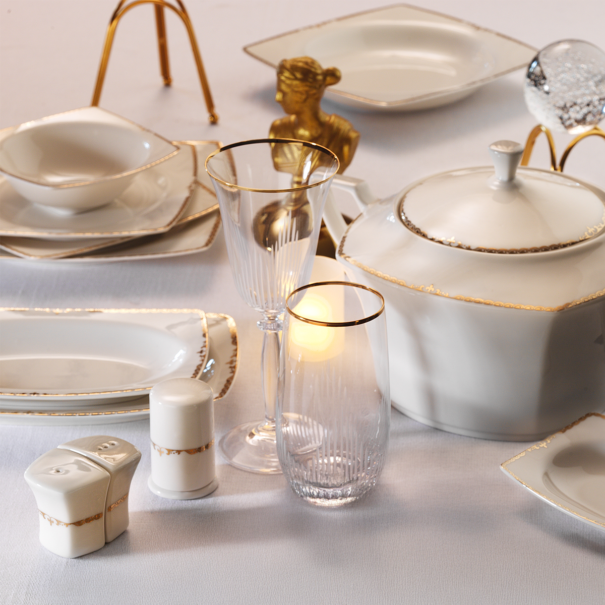 İnce Gold yaldız detayları ve sade tasarımıyla dikkat çeken bu özel takım, sofralarınıza asalet ve denge kazandırır.