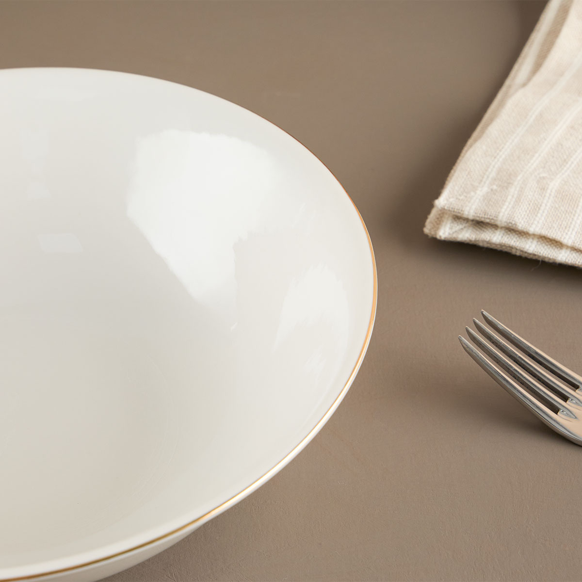 25 cm’lik geniş ölçüsü; salata, meyve, tatlı, çerez ve çeşitli ikramlıklar için ideal bir kullanım alanı sunar. Kalabalık davetlerde rahat servis imkânı sağlarken, günlük sofralarda da pratikliğiyle öne çıkar. Gold detaylar, kaseye lüks bir dokunuş ekleyerek masa düzeninizi daha şık ve bütünlüklü hale getirir.