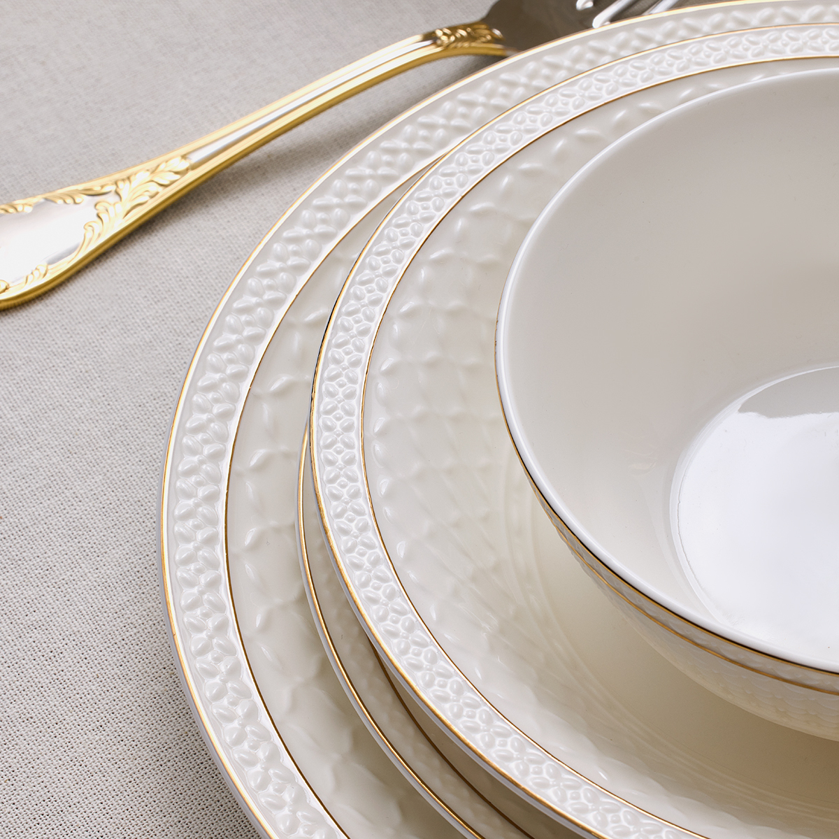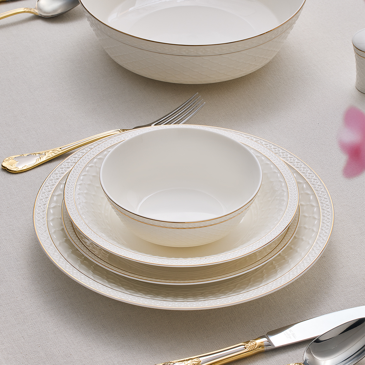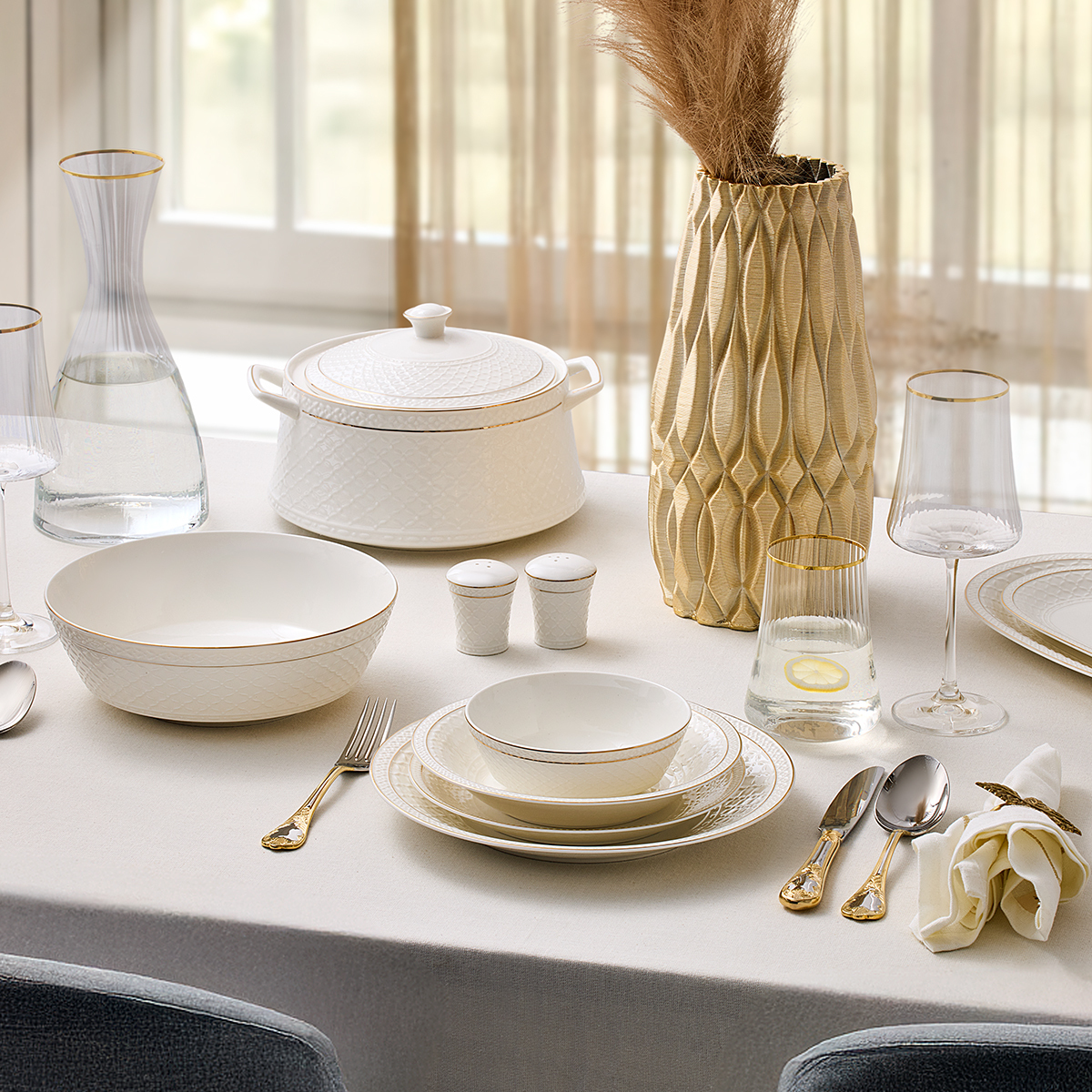 Aryıldız Almada Gold 60 Parça Yemek Takımı, modern çizgilerle klasik zarafeti birleştiren göz alıcı bir koleksiyon sunuyor.