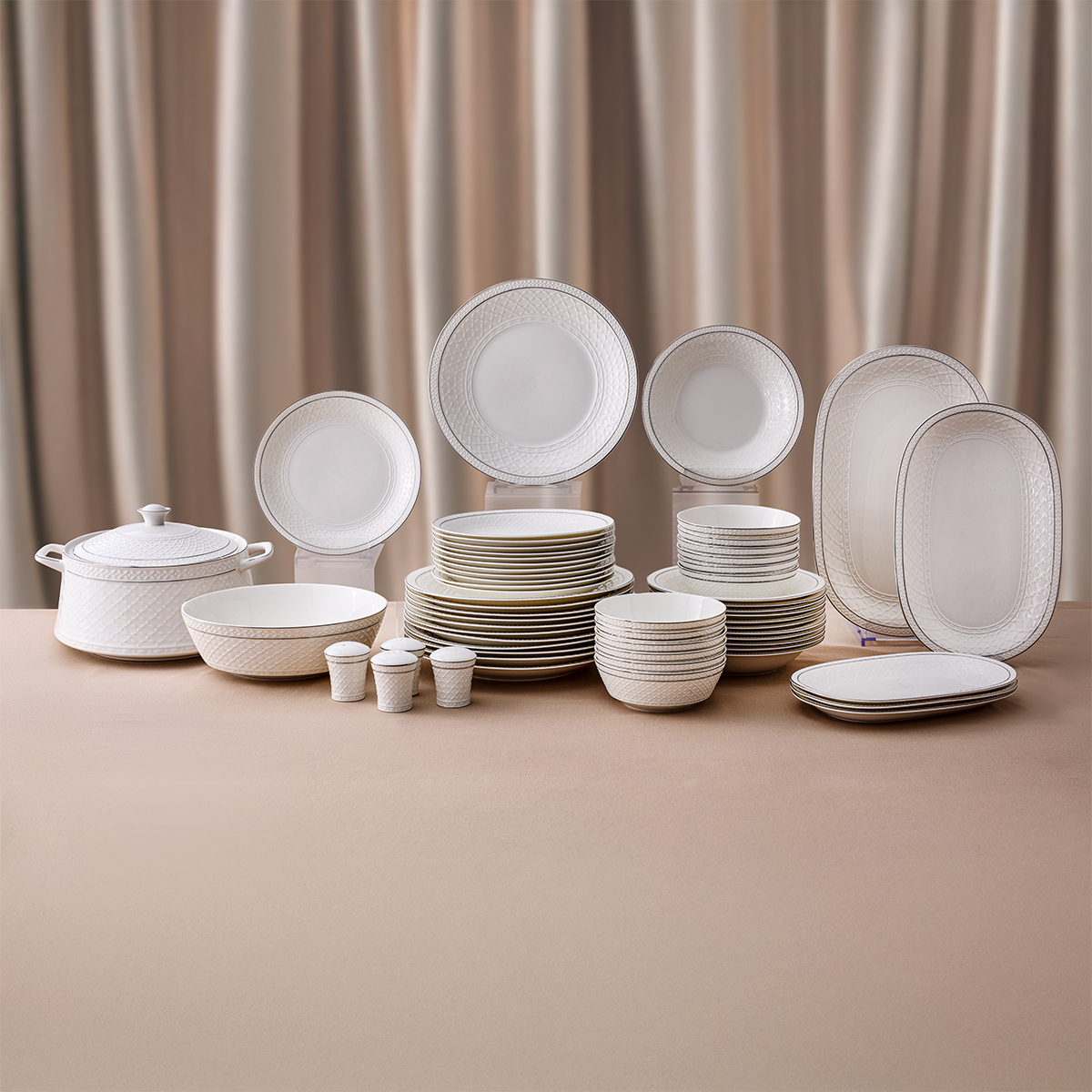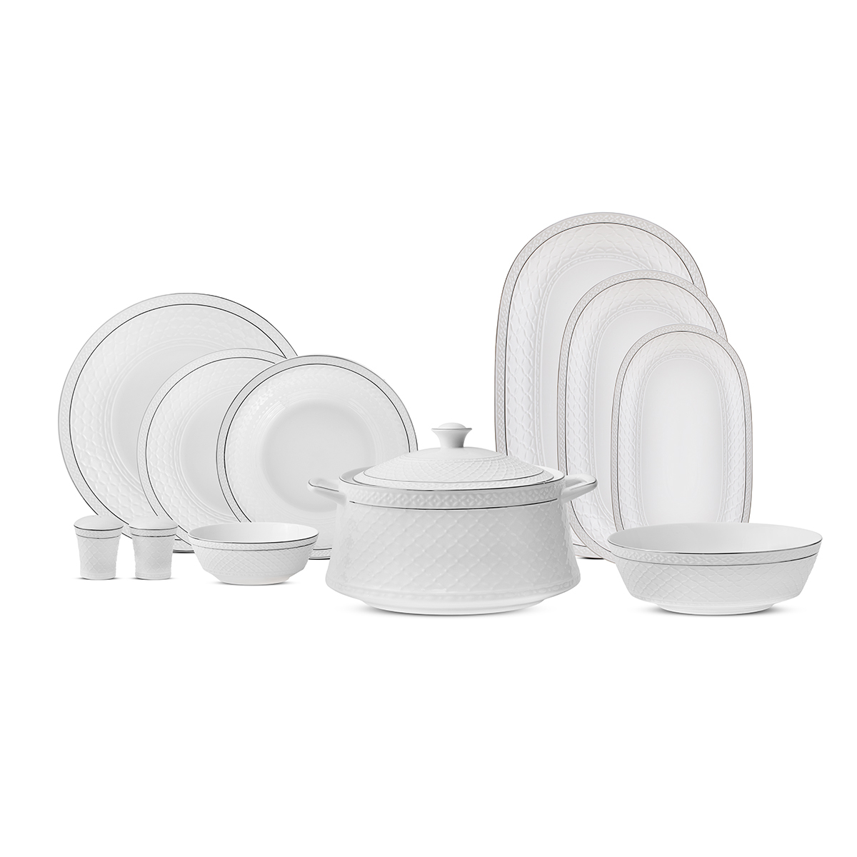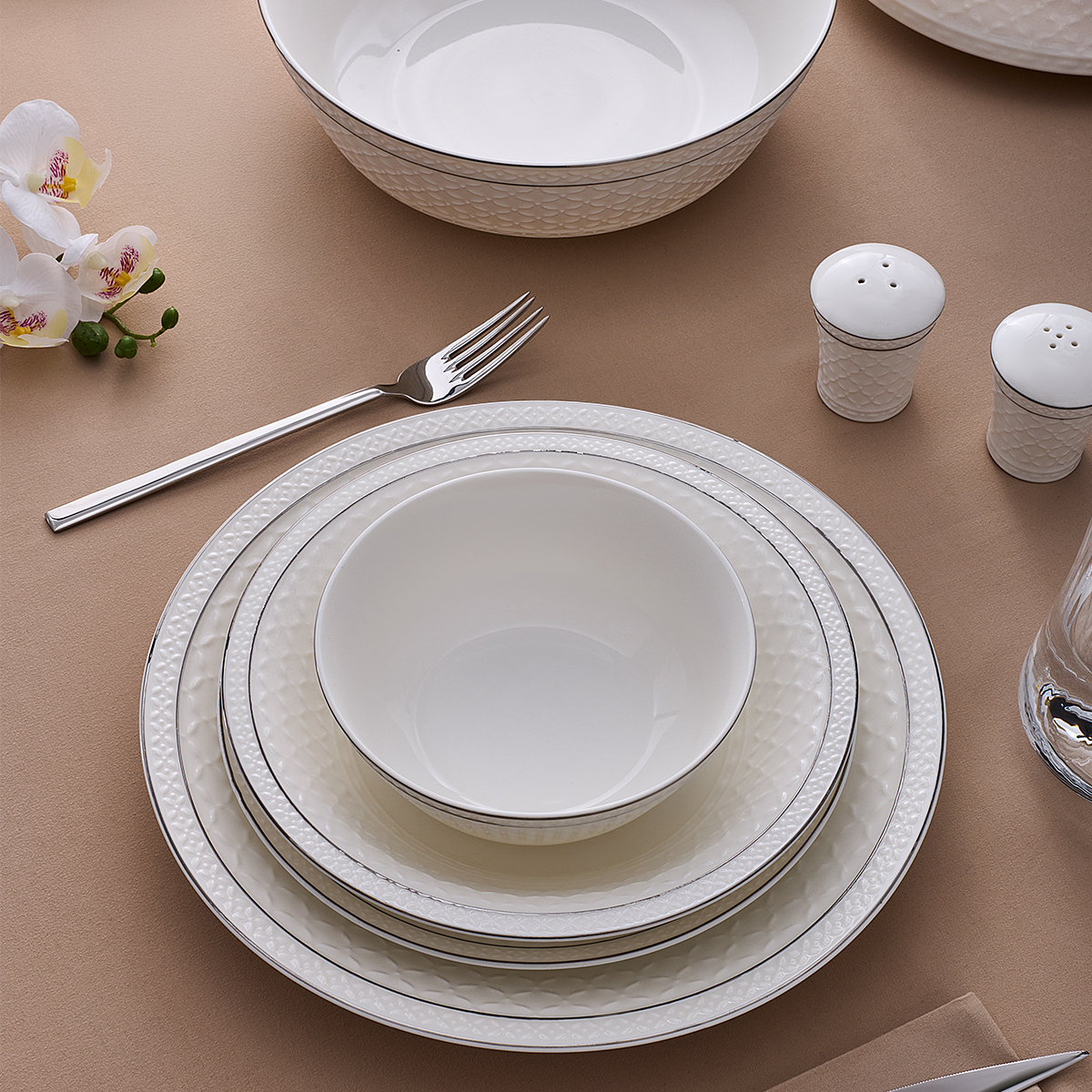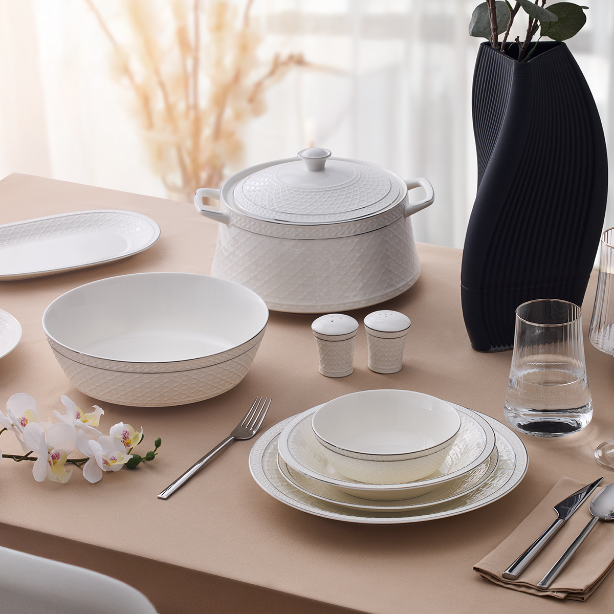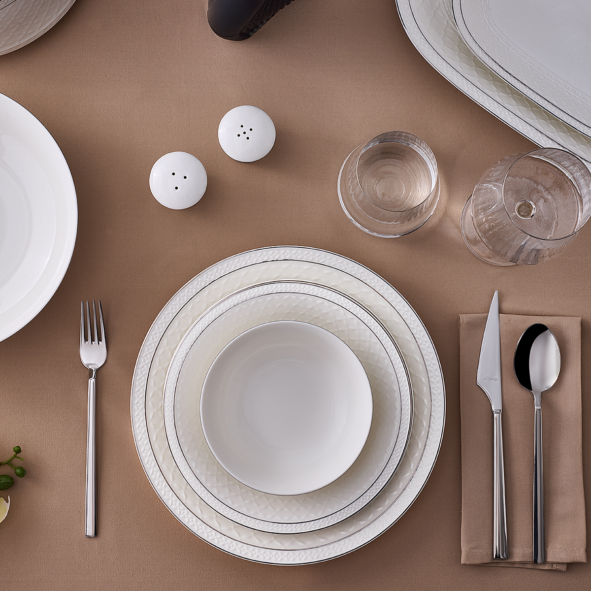 Aryıldız Almada Platin 60 Parça Yemek Takımı, modern çizgilerle klasik zarafeti birleştiren göz alıcı bir koleksiyon sunuyor.