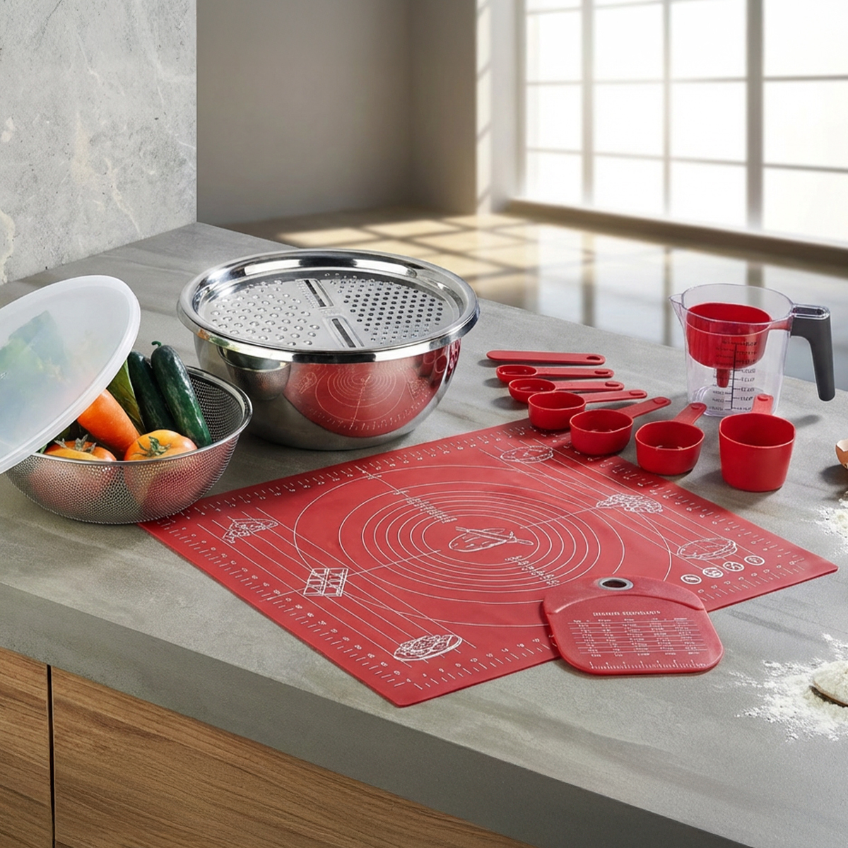 9 Parça Çok Amaçlı Set: 1 büyük ölçüm kabı, 1 huni, 4 farklı boyda kupa, 2 yemek kaşığı ölçüsü ve 1 düzleştirici sileceği içerir.