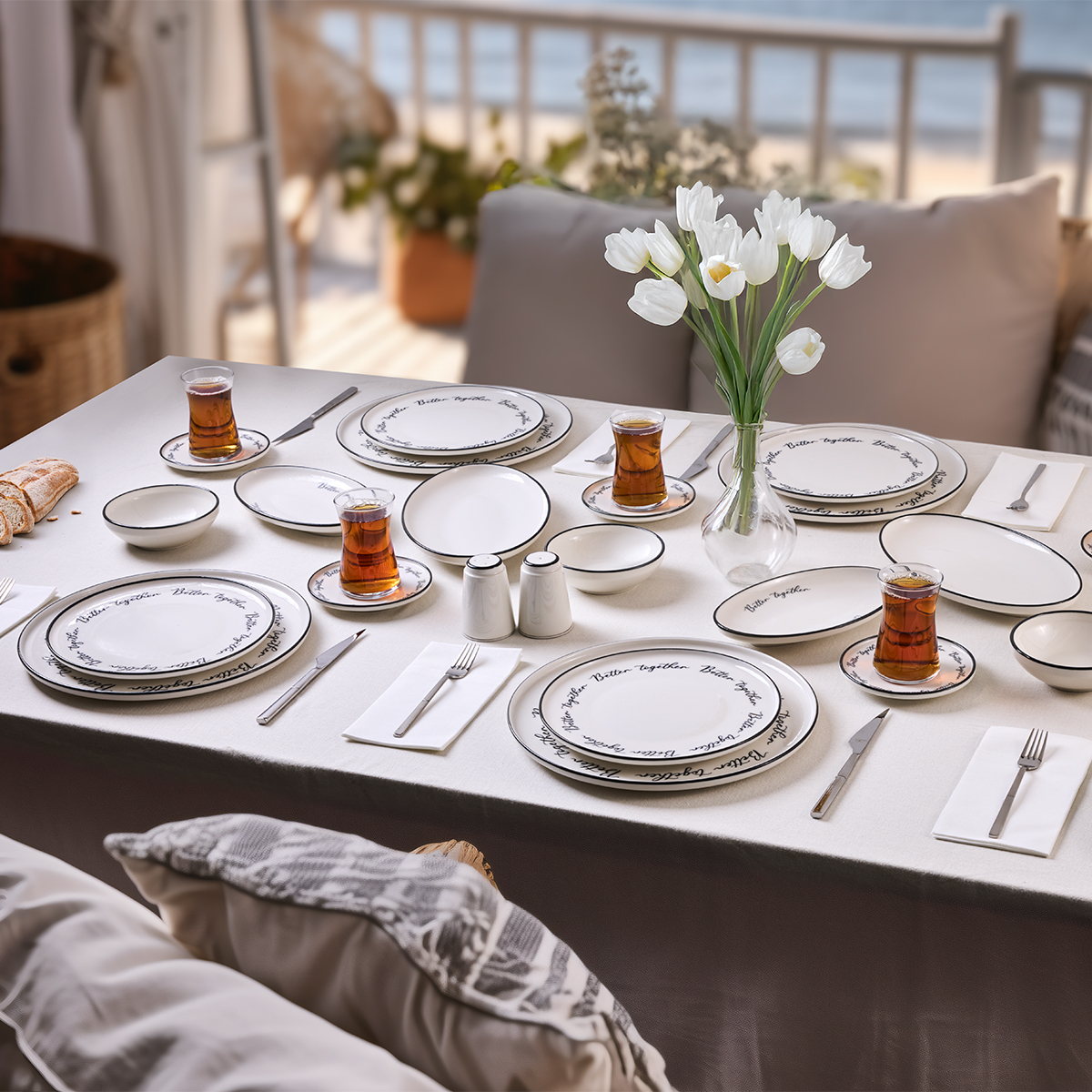 34 parçalık bu set, keyifli bir kahvaltı için ihtiyaç duyulan her detayı barındırır. Tabaklar, çay bardakları, reçellikler, zeytinlikler bir bütün olarak uyum içinde tasarlanmıştır. Her parça, hem fonksiyonelliği hem de estetik duruşuyla sofralarınızı tamamlar.