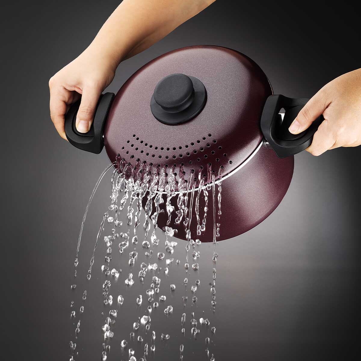 Tenceredeki Fazla suyu boşaltmayı daha güvenli ve uygun hale getirmek için kulplar aracılığıyla kendinden süzme deliklerine sahip kapak yerine oturur.