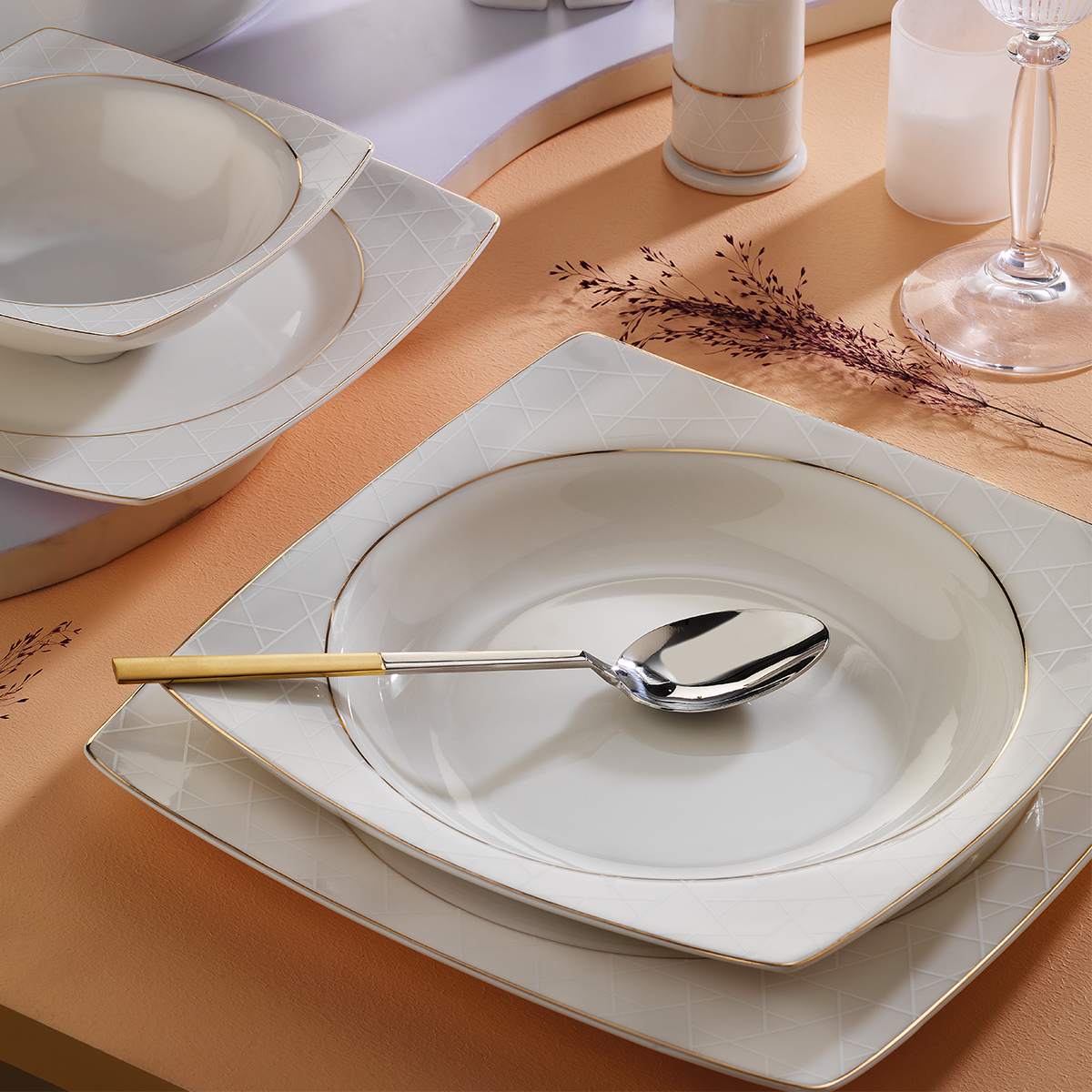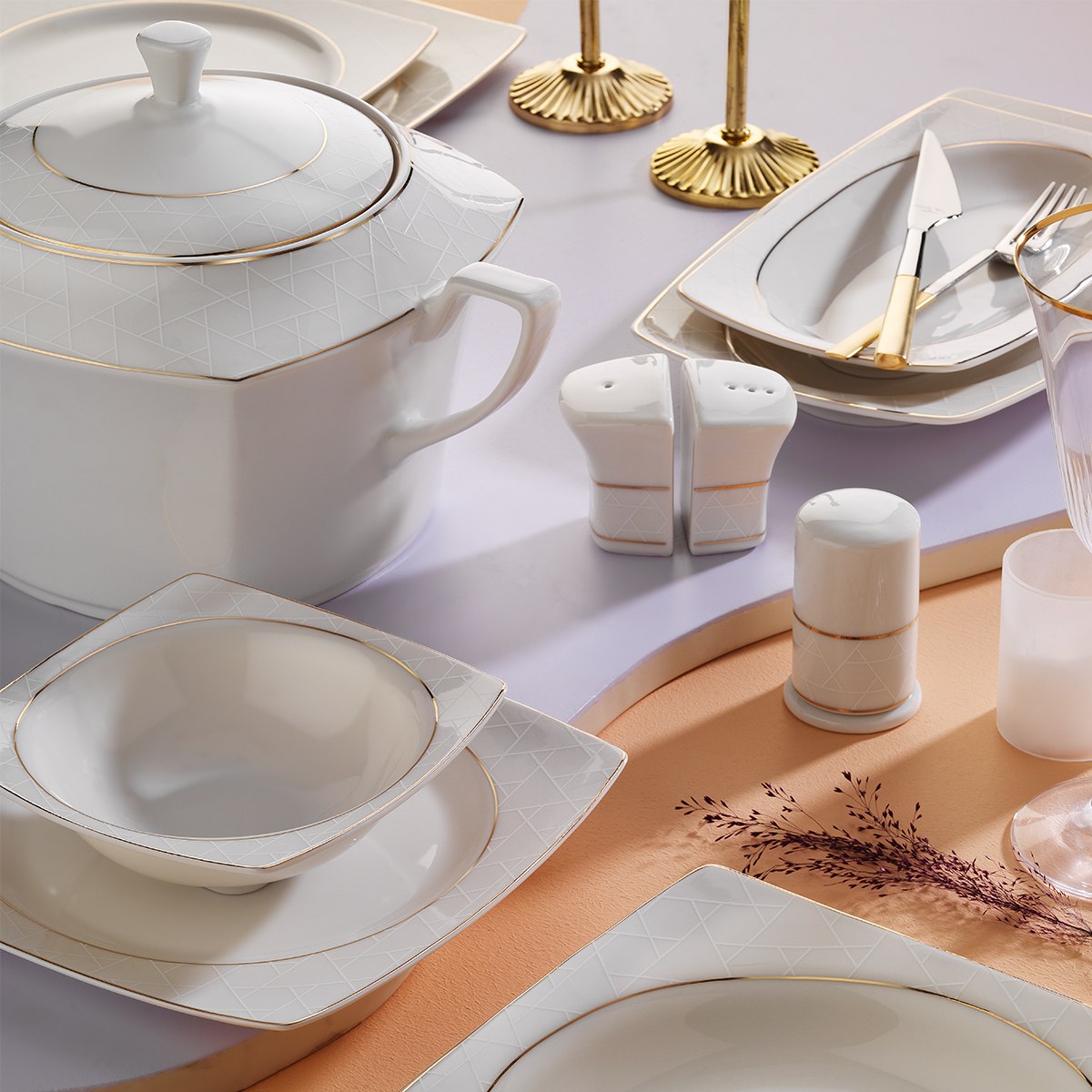 Aryıldız 62 Parça Yemek Takımı, modern çizgilerle klasik zarafeti birleştiren göz alıcı bir koleksiyon sunuyor.