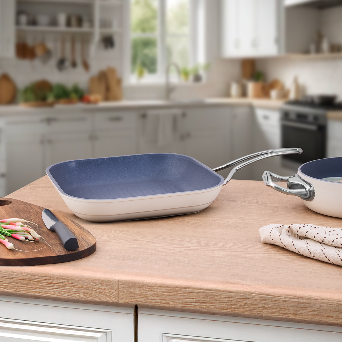 Bu koleksiyondaki her parçanın paslanmaz çelik tutacakları rahat bir tutuş sağlarken, fırında kullanılabilir özellikleriyle yemek pişirme deneyiminizi bir üst seviyeye taşıyor.