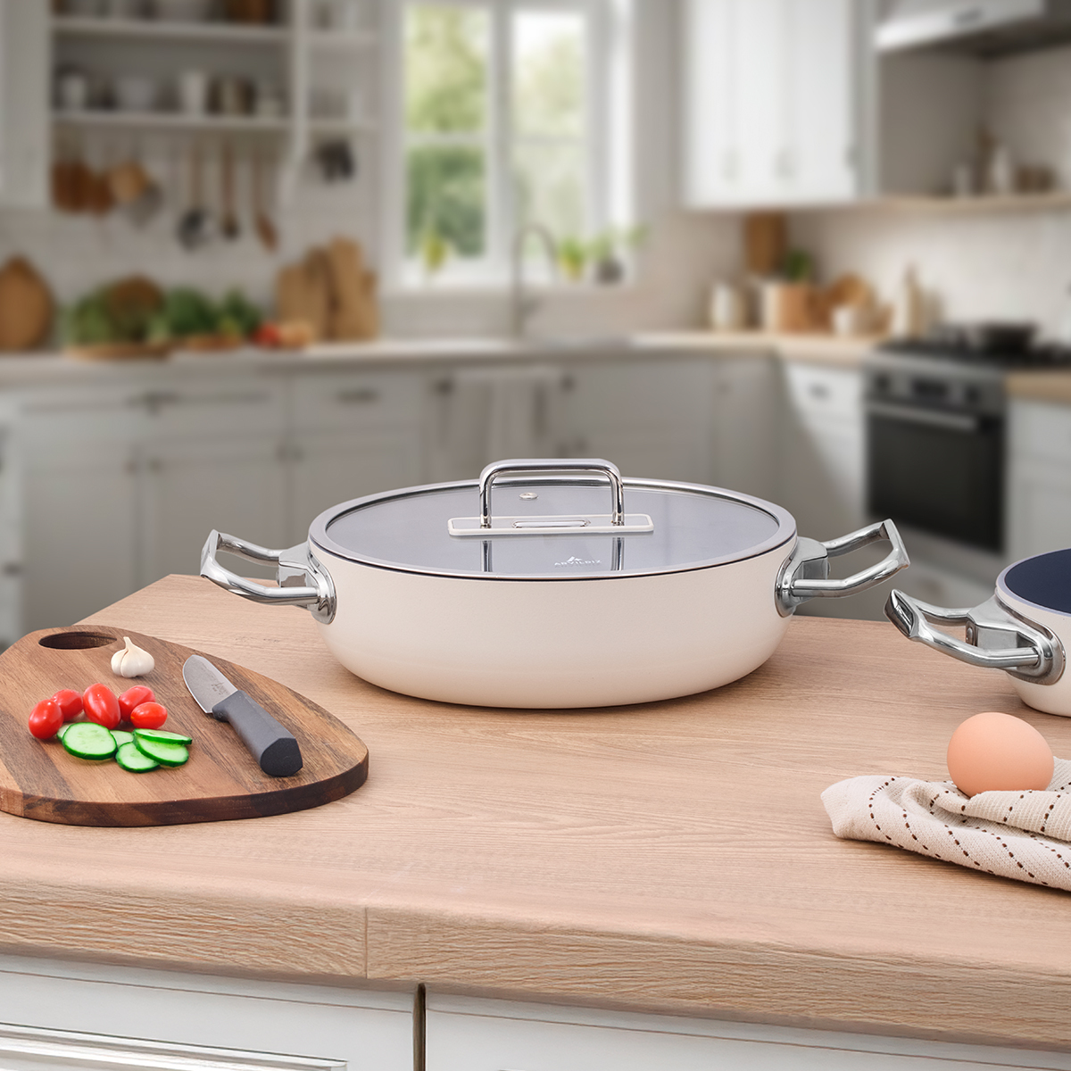 Bu koleksiyondaki her parçanın paslanmaz çelik tutacakları rahat bir tutuş sağlarken, fırında kullanılabilir özellikleriyle yemek pişirme deneyiminizi bir üst seviyeye taşıyor.