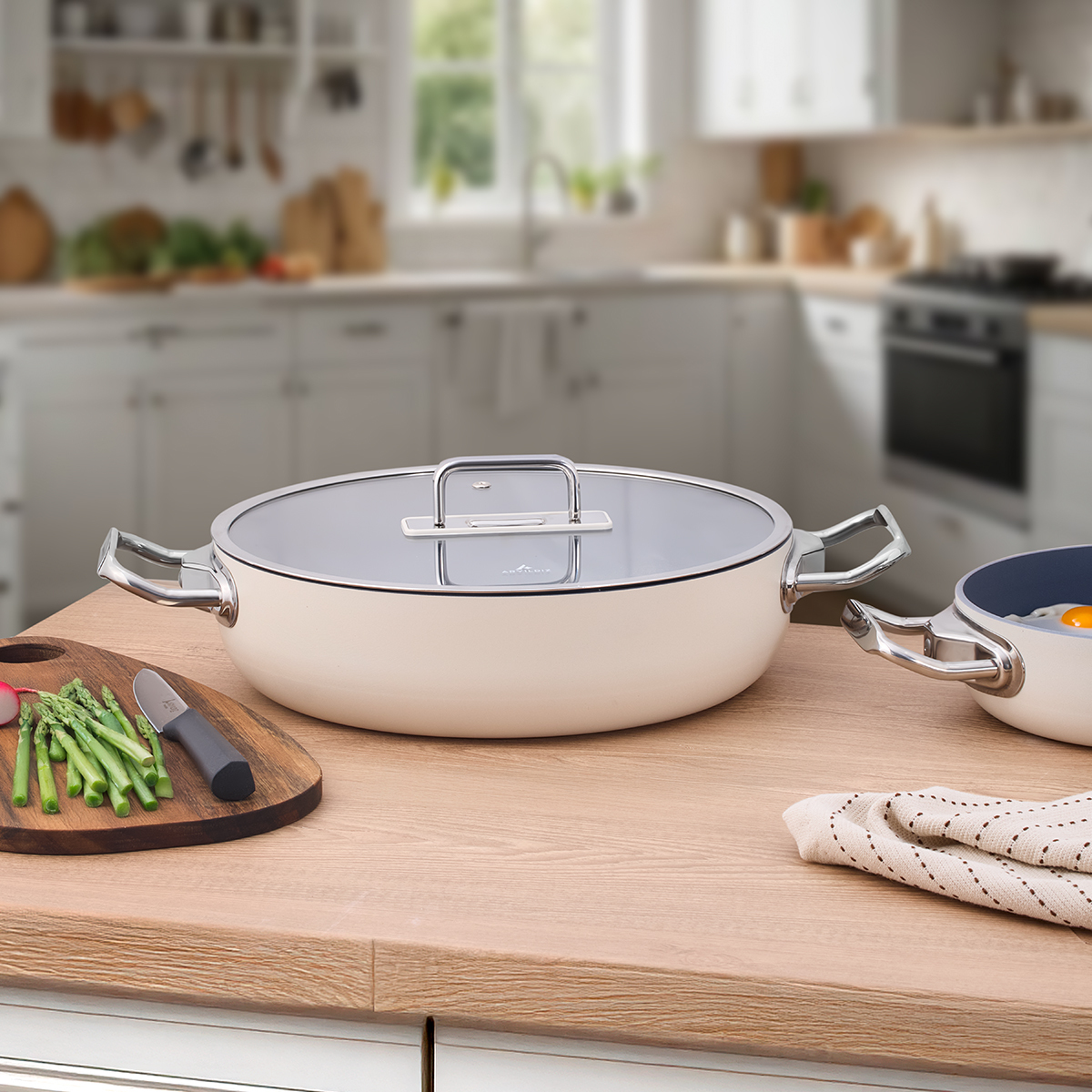Bu koleksiyondaki her parçanın paslanmaz çelik tutacakları rahat bir tutuş sağlarken, fırında kullanılabilir özellikleriyle yemek pişirme deneyiminizi bir üst seviyeye taşıyor.
