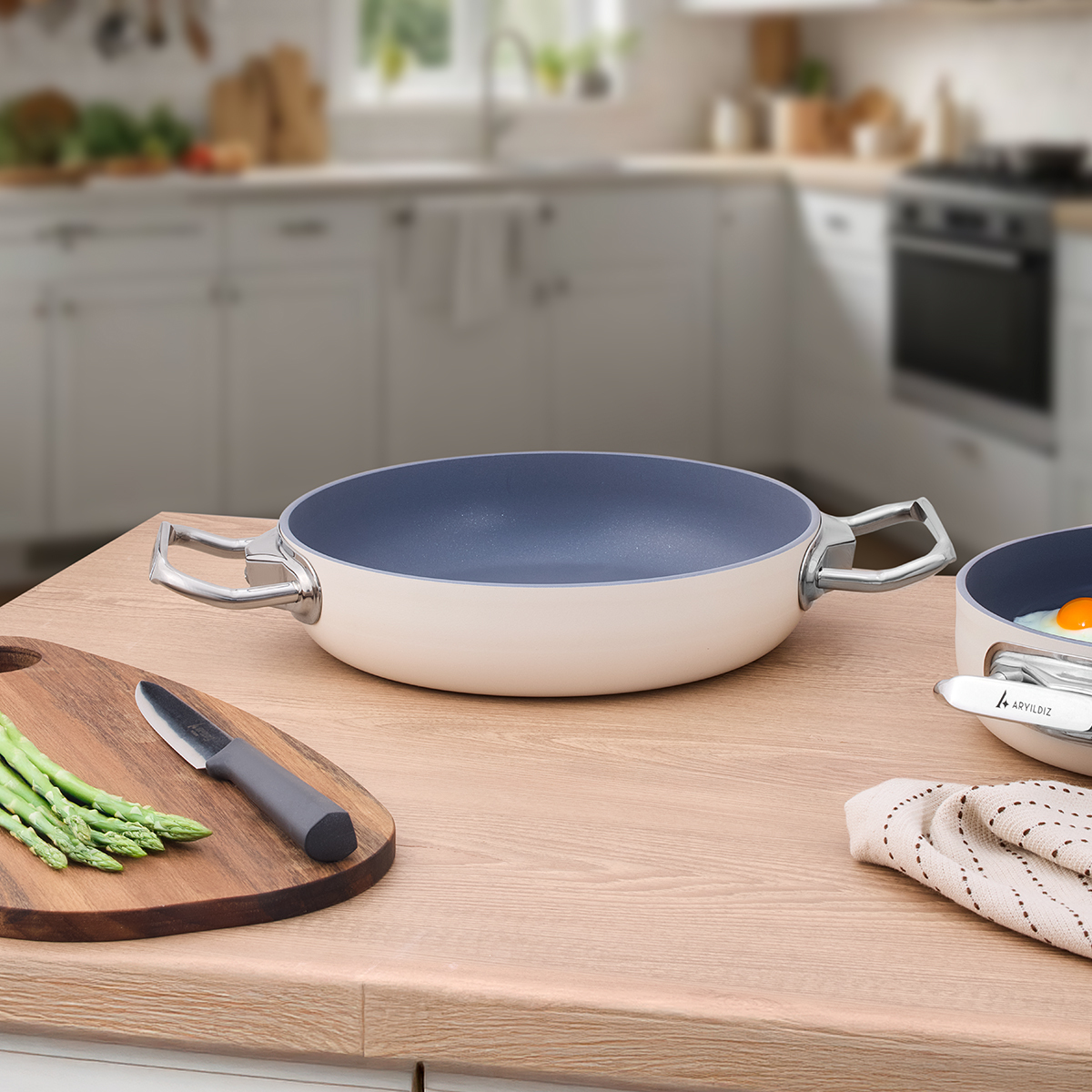 Bu koleksiyondaki her parçanın paslanmaz çelik tutacakları rahat bir tutuş sağlarken, fırında kullanılabilir özellikleriyle yemek pişirme deneyiminizi bir üst seviyeye taşıyor.