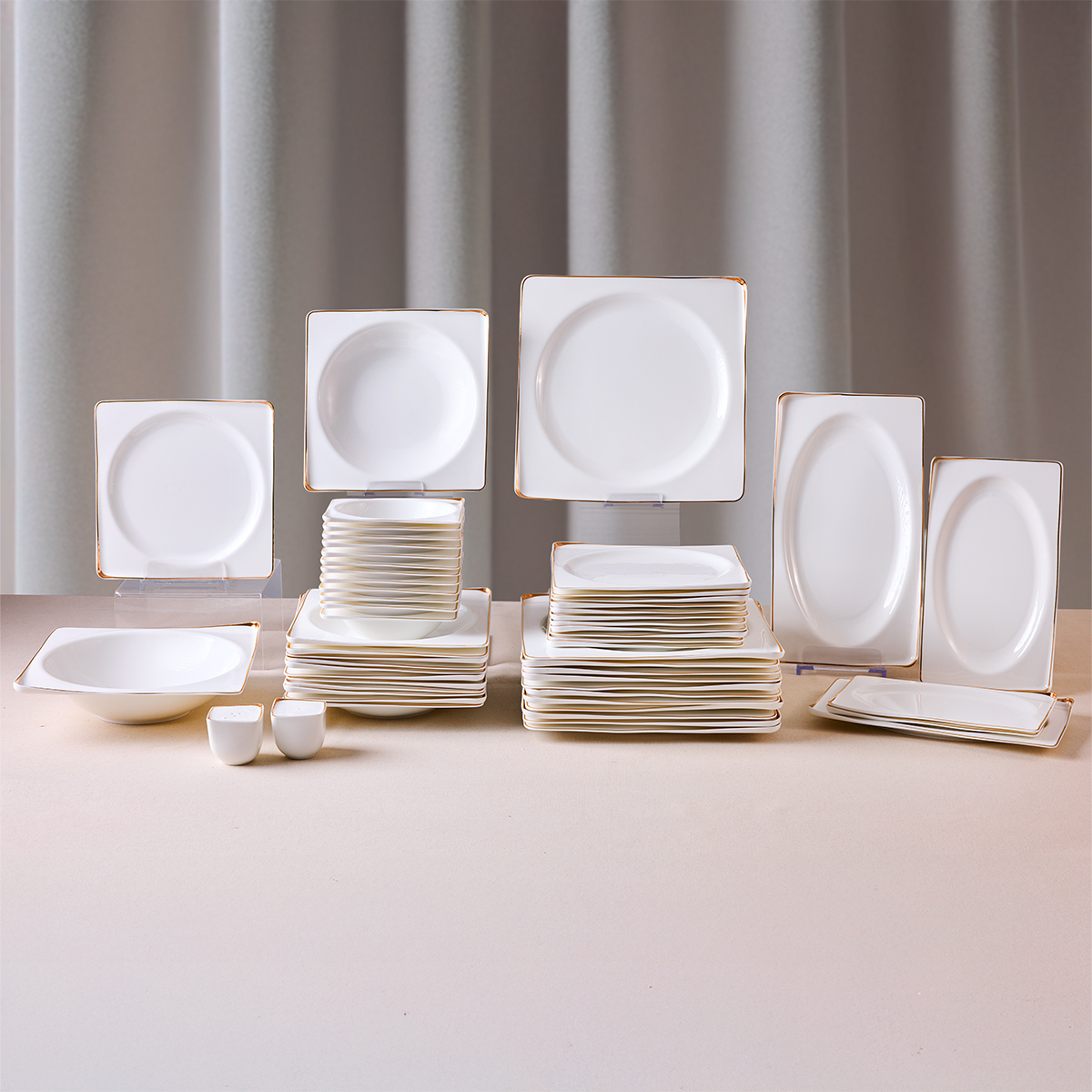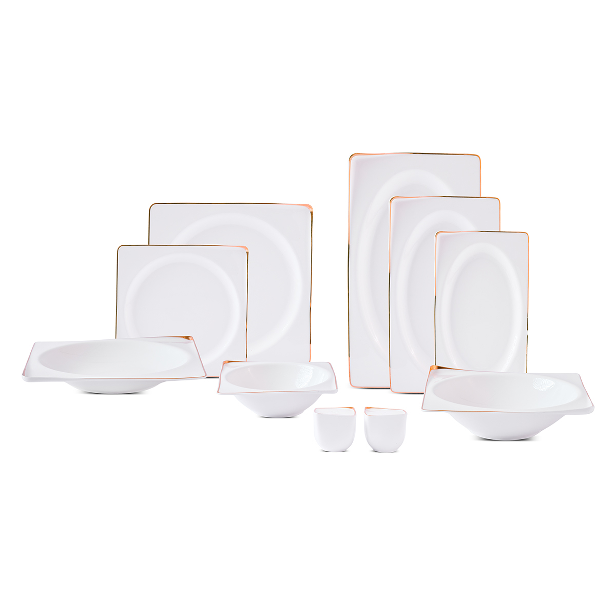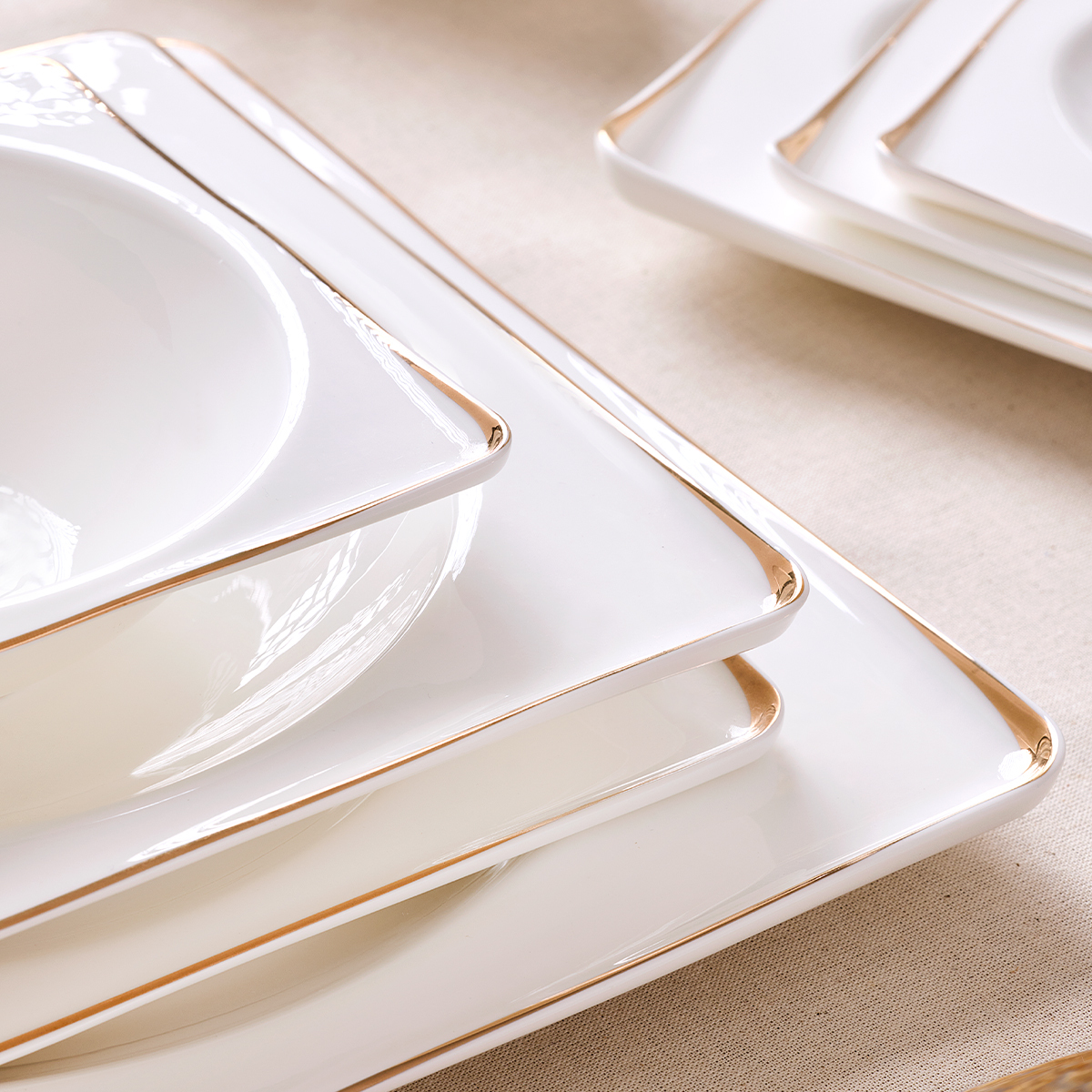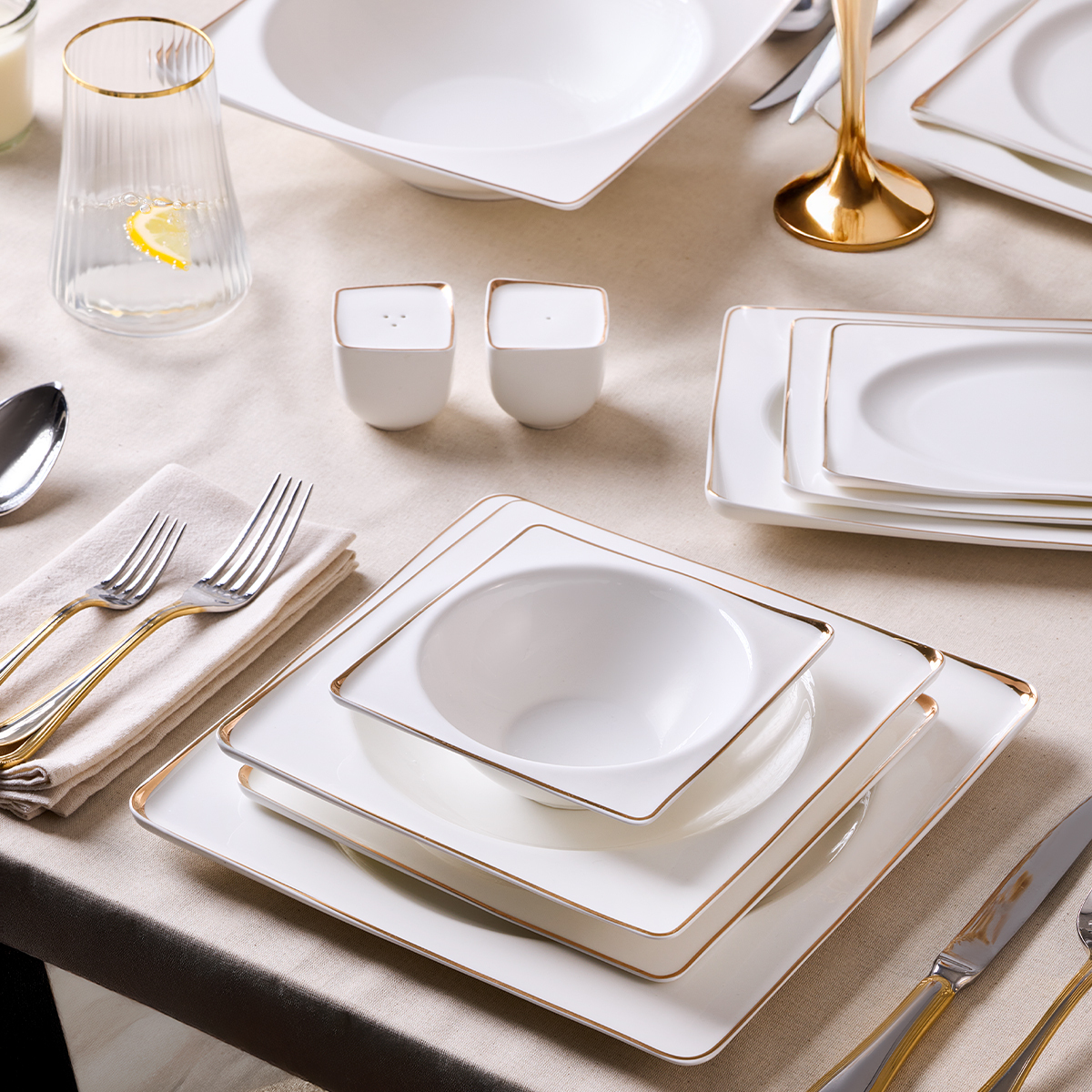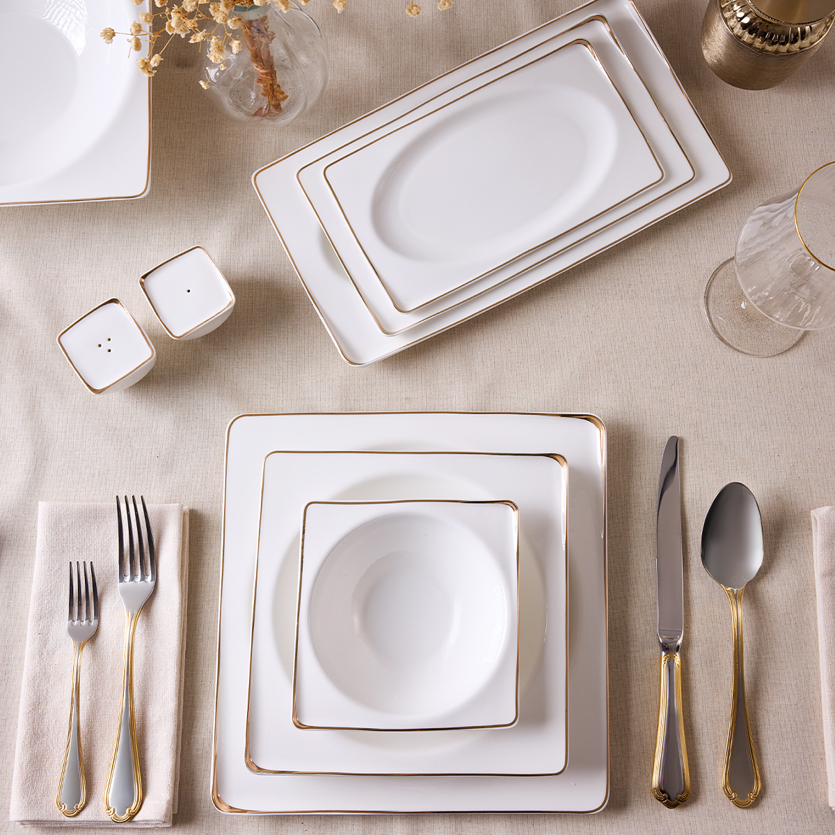 Yalın ama etkili altın şerit detaylarıyla, klasik ve modern sofraları bir araya getiren bir duruş sergiliyor.