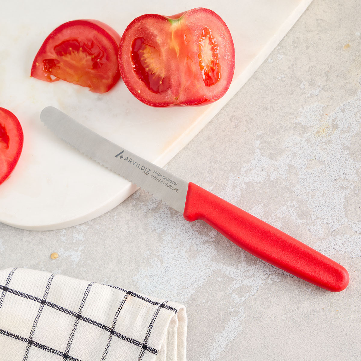 Gelince Haber VerAryıldız Daily domates bıçağı, mutfakta zarafet ve işlevselliği bir araya getirir. 11 cm uzunluğundaki paslanmaz çelik bıçağı, özellikle domates gibi kabuğu ince ve içi sulu sebzeleri kolayca dilimlemenizi sağlar. İnce ve keskin ucu, meyve ve sebzeleri ezmeden pürüzsüz kesim yapmanıza yardımcı olur.