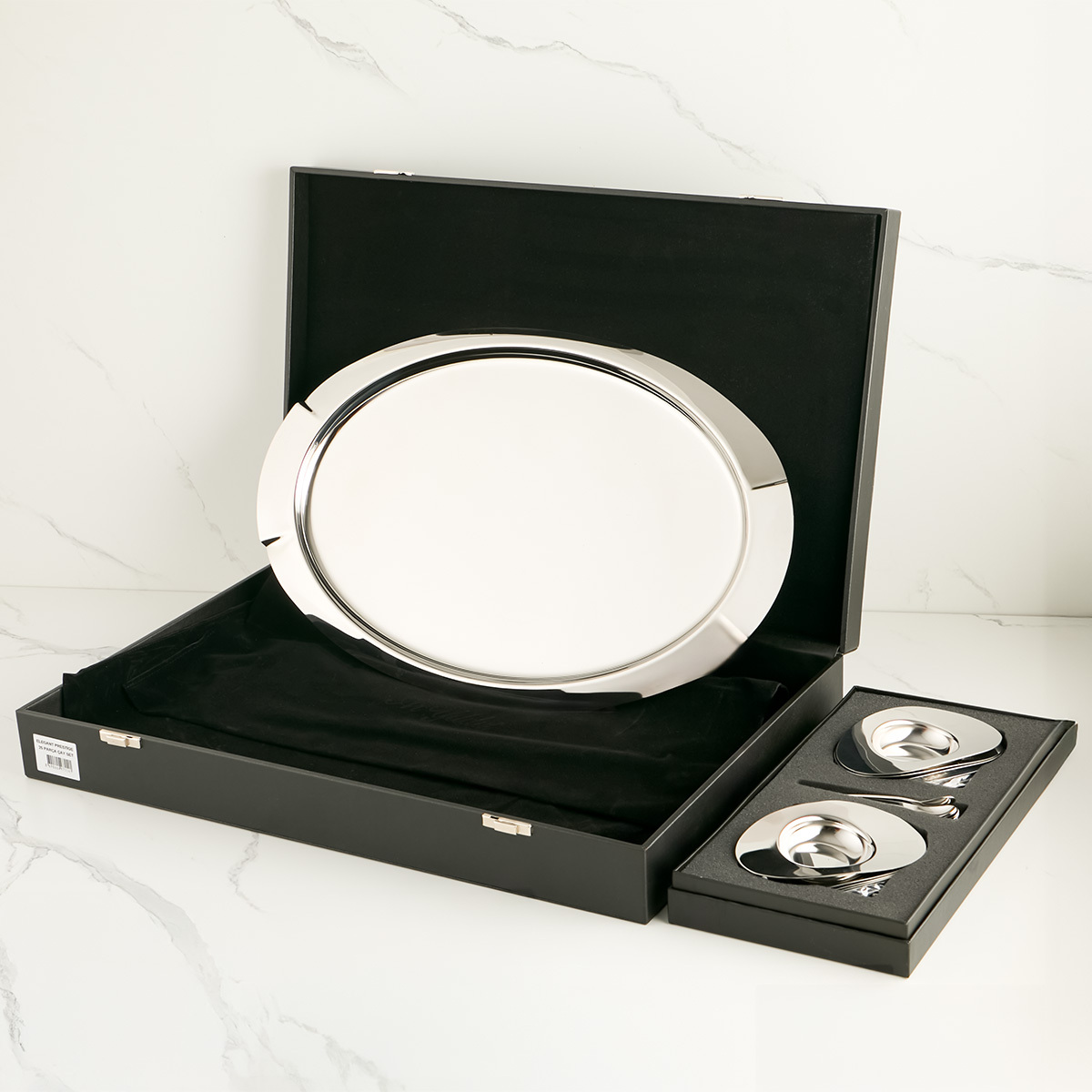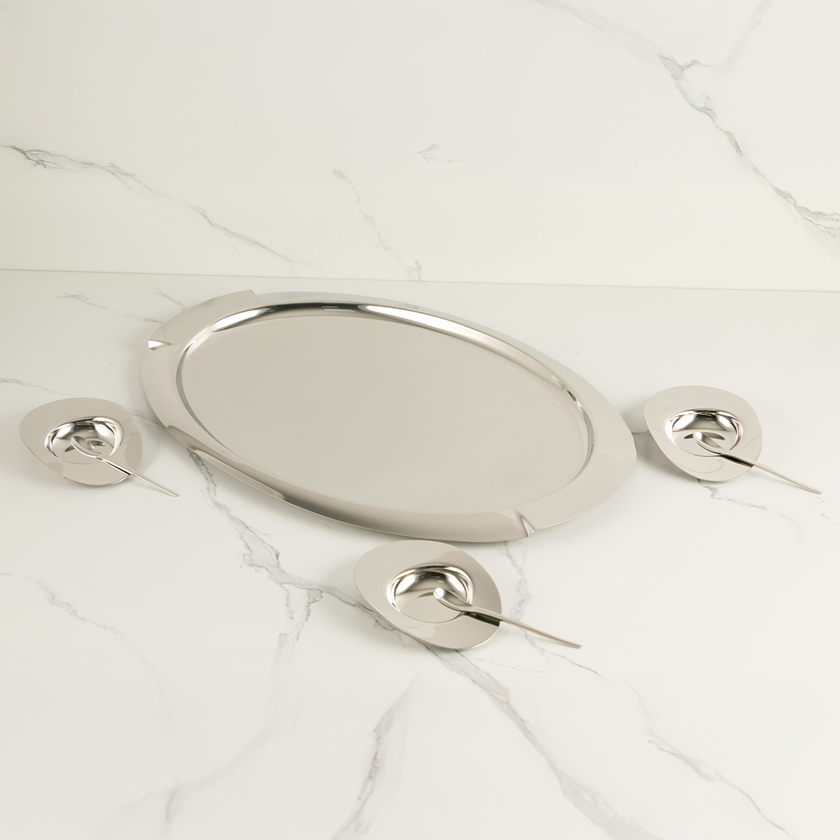 Parlak çelik yüzeyi ve modern kulp detayları ile göz alıcı bir tasarıma sahip. Geniş yüzeyi sayesinde tüm seti kolayca taşır ve sunumunuzu şıklıkla tamamlar.