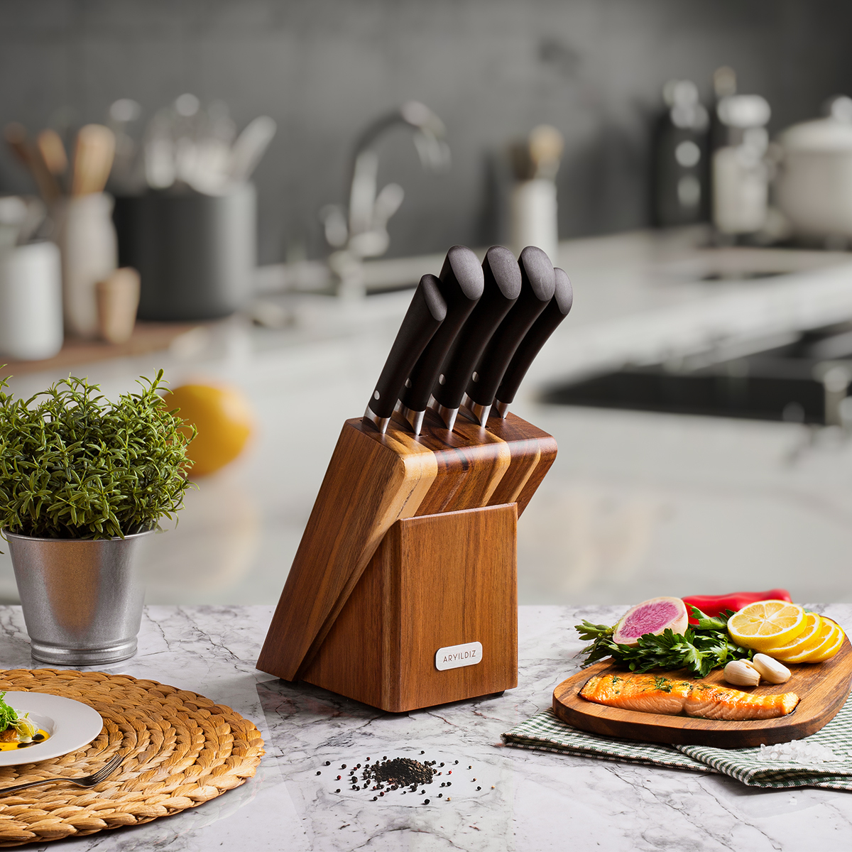 Essential blok bıçak seti, her mutfakta bulunması gereken, günlük kullanım için tasarlanmış pratik ve dayanıklı bıçaklardan oluşur.