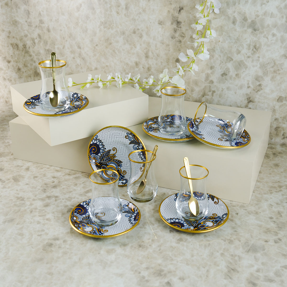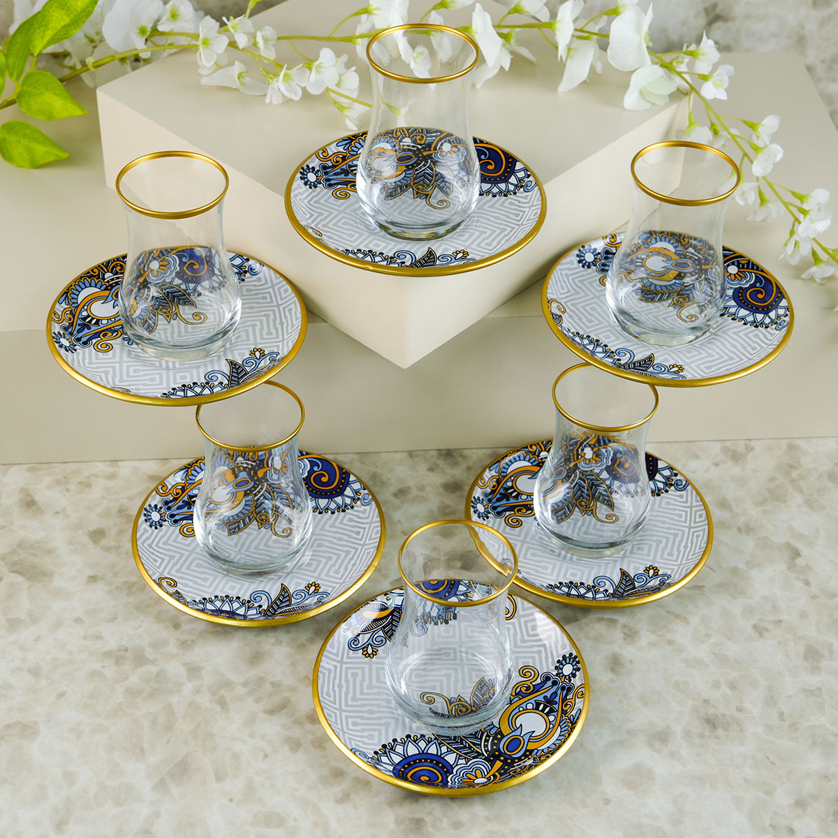 Çay Bardağı Takımı, zarif tasarımı ve altın yaldız detaylarıyla çay keyfinizi bir üst seviyeye taşıyor.