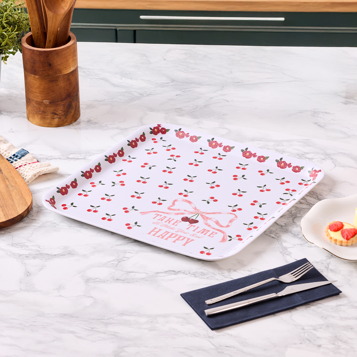 32×32 cm’lik büyük ölçüsü; çay ve kahve servisleri, tatlı tabakları, ikramlıklar ve çoklu sunumlar için geniş ve kullanışlı bir alan sunar. Dengeli yapısı sayesinde servis sırasında güvenli kullanım sağlarken, kare formu ile sunumlarınızda simetrik ve profesyonel bir görünüm oluşturur.