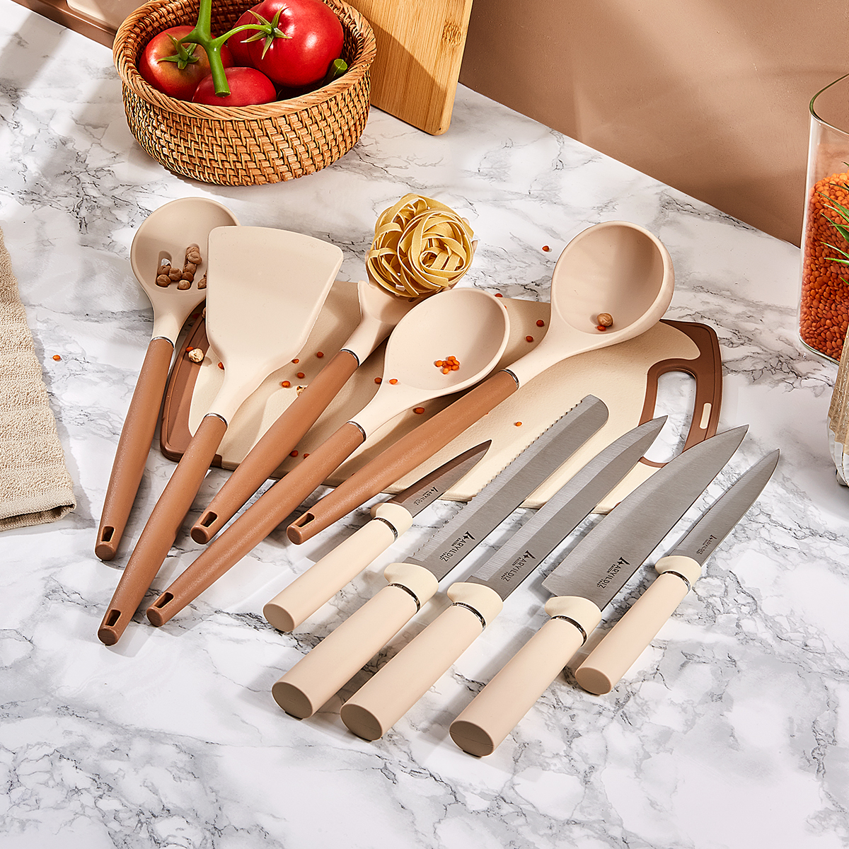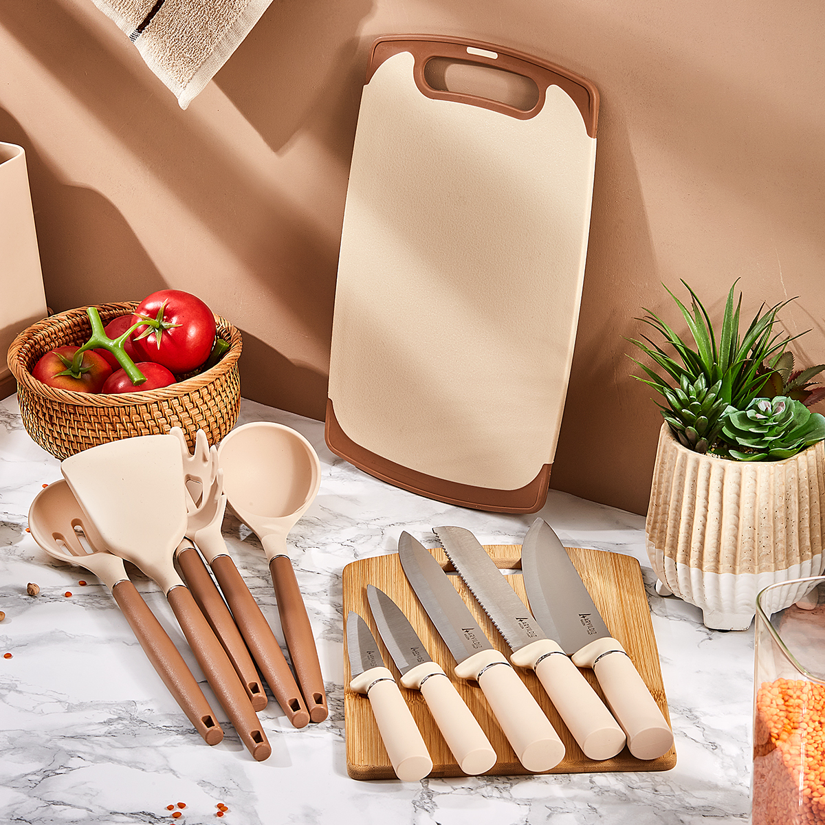 Estetik ve Düzenli Görünüm: Şık bıçak bloğu ve uyumlu kesme tahtası ile mutfağınıza düzen ve stil katar.