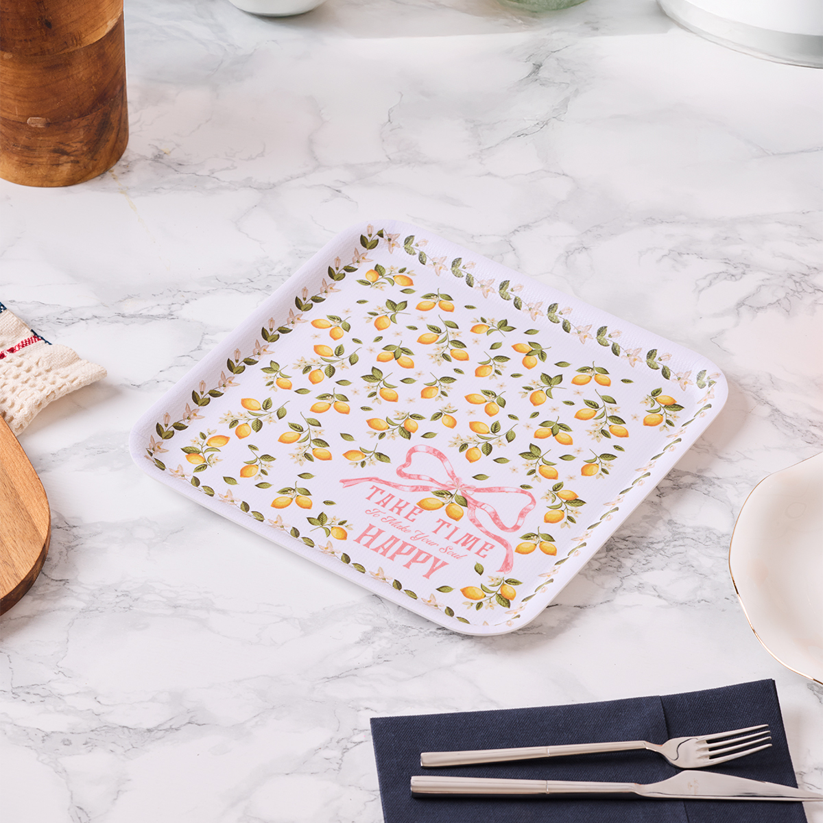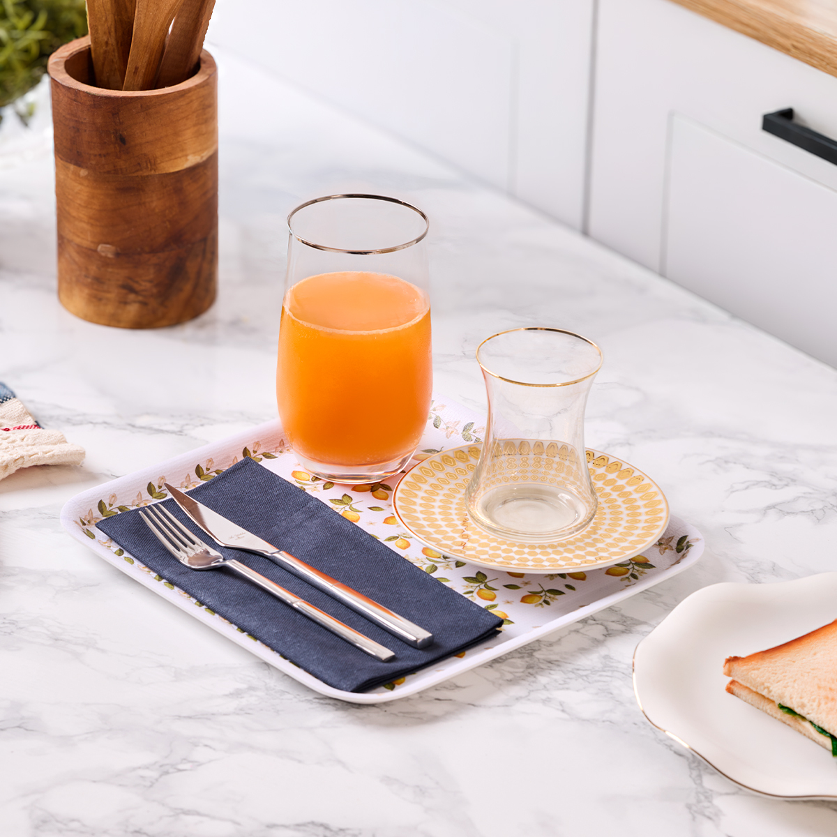 24×24 cm ölçüsü; çay, kahve, tatlı, atıştırmalık ve küçük ikramlık servisleri için ideal bir kullanım alanı sağlar. Kare formu sayesinde düzenli ve dengeli sunumlar yapmanıza yardımcı olur. Günlük kullanımlarda pratiklik sunarken, misafir ağırlamalarında da sofranıza özenli bir görünüm kazandırır.