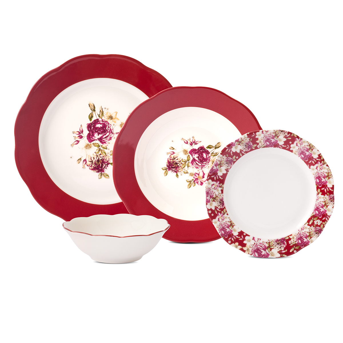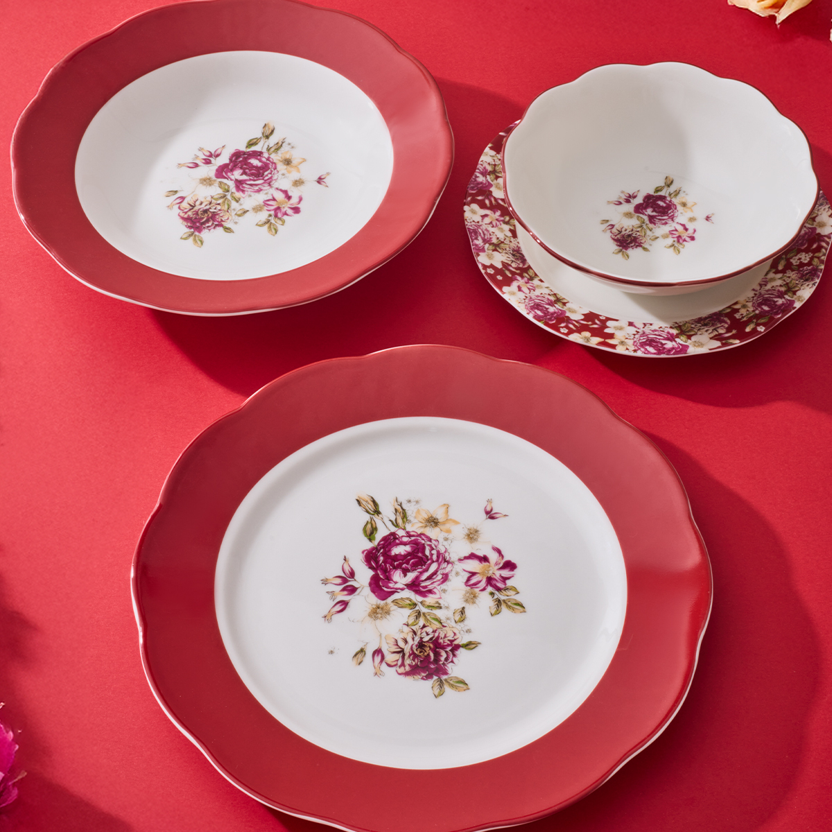 Kırmızının büyüleyici tonlarıyla tasarlanan bu özel yemek takımı, hem günlük kullanıma hem de misafir sofralarına şıklık kazandırmak için ideal.