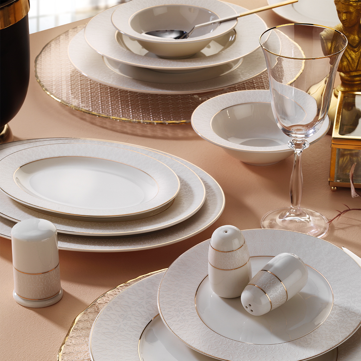 İnce gold yaldız detayları ve sade tasarımıyla dikkat çeken bu özel takım, sofralarınıza asalet ve denge kazandırır.