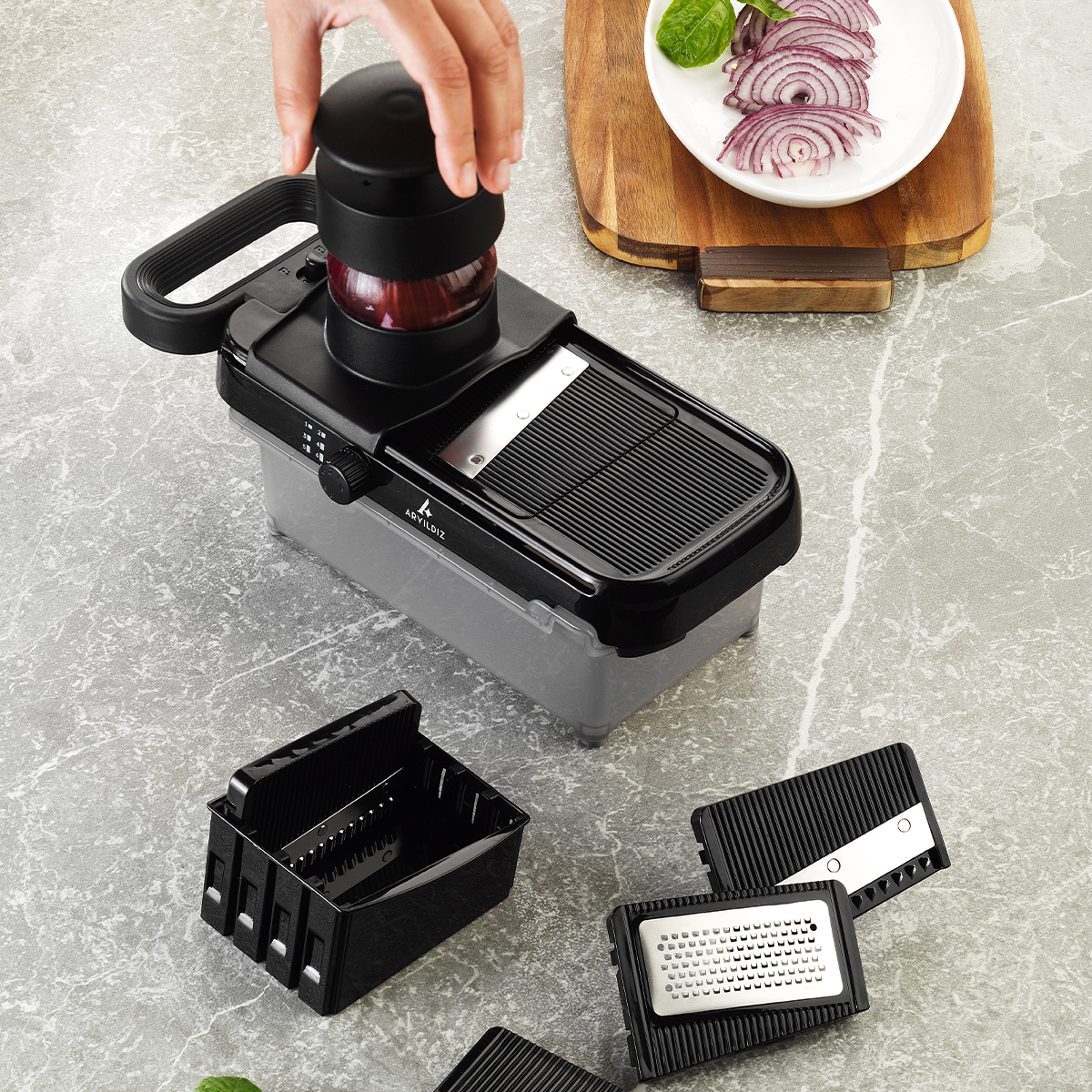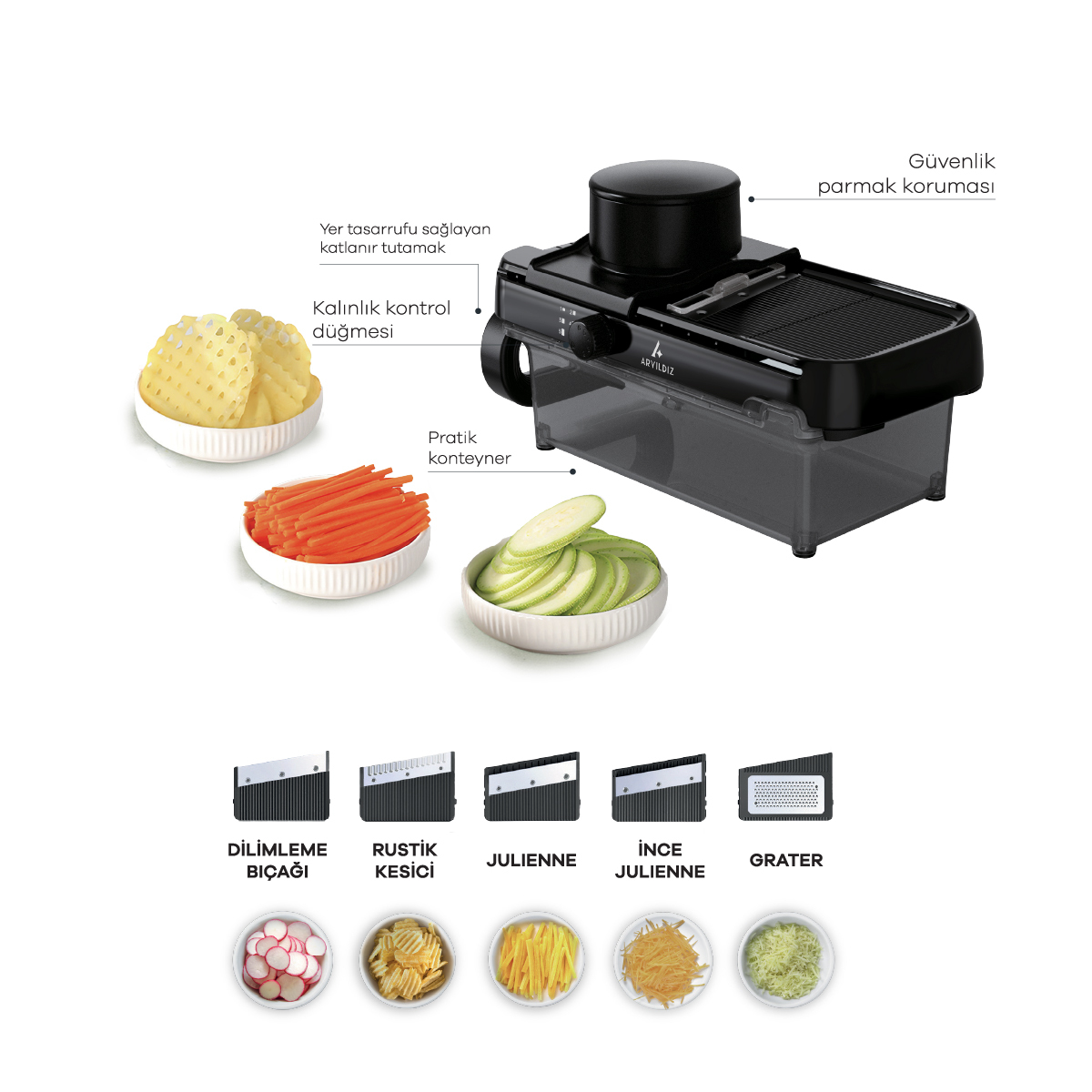 Mutfakta hız, pratiklik ve kusursuz sonuçlar arayanlar için ARYILDIZ Master Çok Amaçlı Doğrayıcı Set, tüm beklentileri tek bir sette topluyor. Kesme, doğrama, dilimleme ve rendeleme işlerini saniyeler içinde zahmetsizce yaparak hem zaman kazandırıyor hem de yemek hazırlığını keyfe dönüştürüyor.