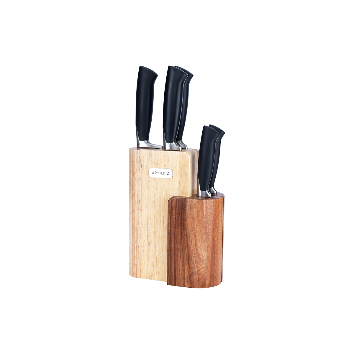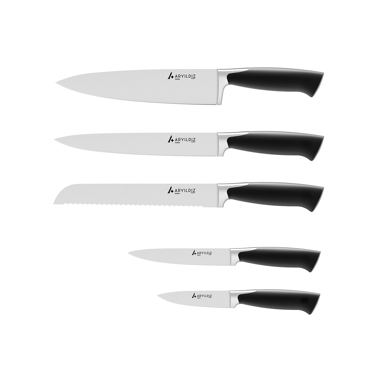 Paslanmaz çelik bıçaklar, ergonomik saplarla birleşerek mükemmel bir kullanım deneyimi sunar."
