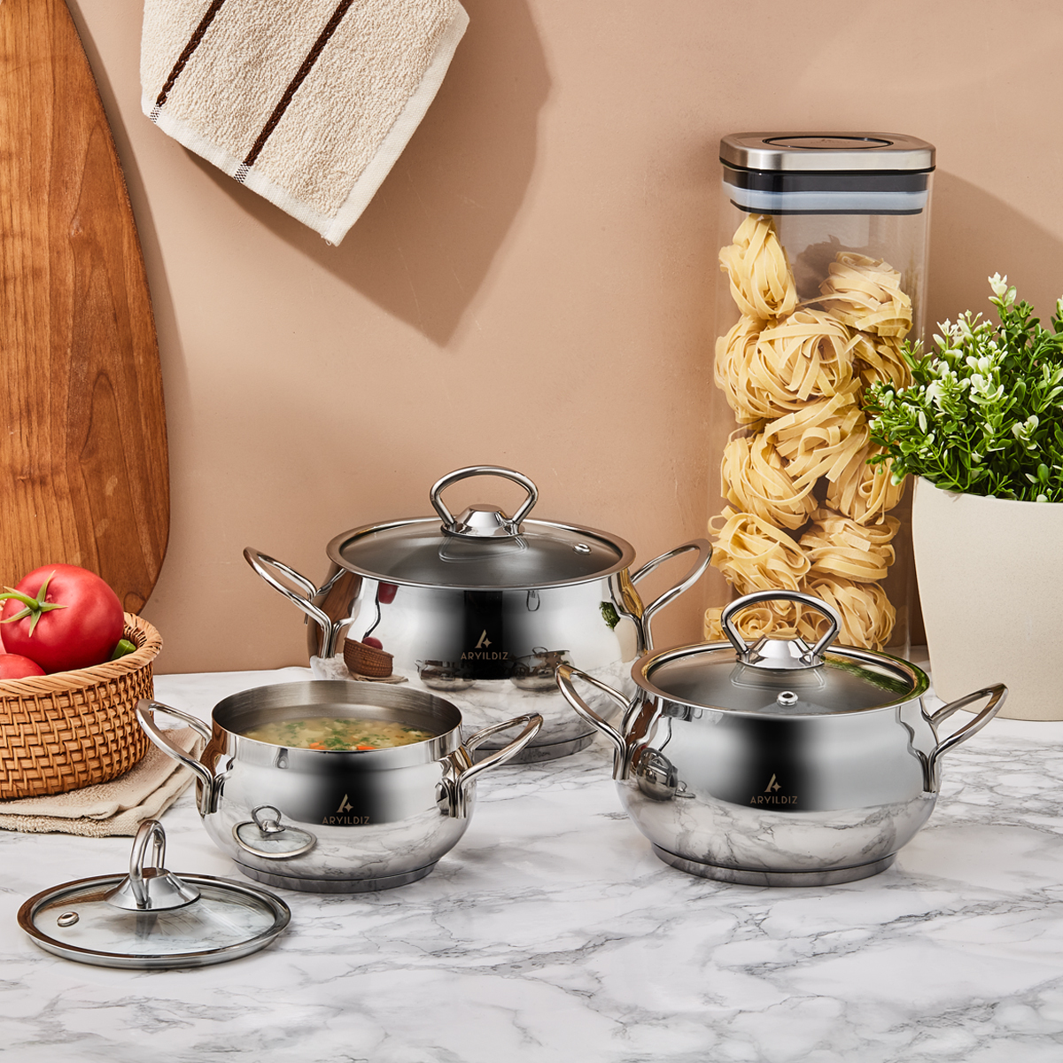 Gelince Haber VerAryıldız Olden Maxi Tencere Seti, paslanmaz çelikten imal edilmiştir. Hem elde hem bulaşık makinesinde yıkanma özelliğine sahiptir.
