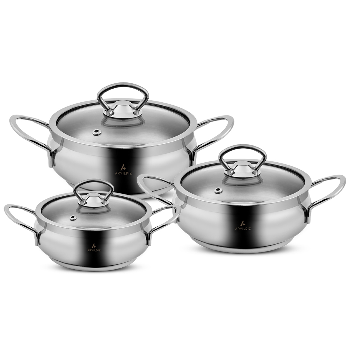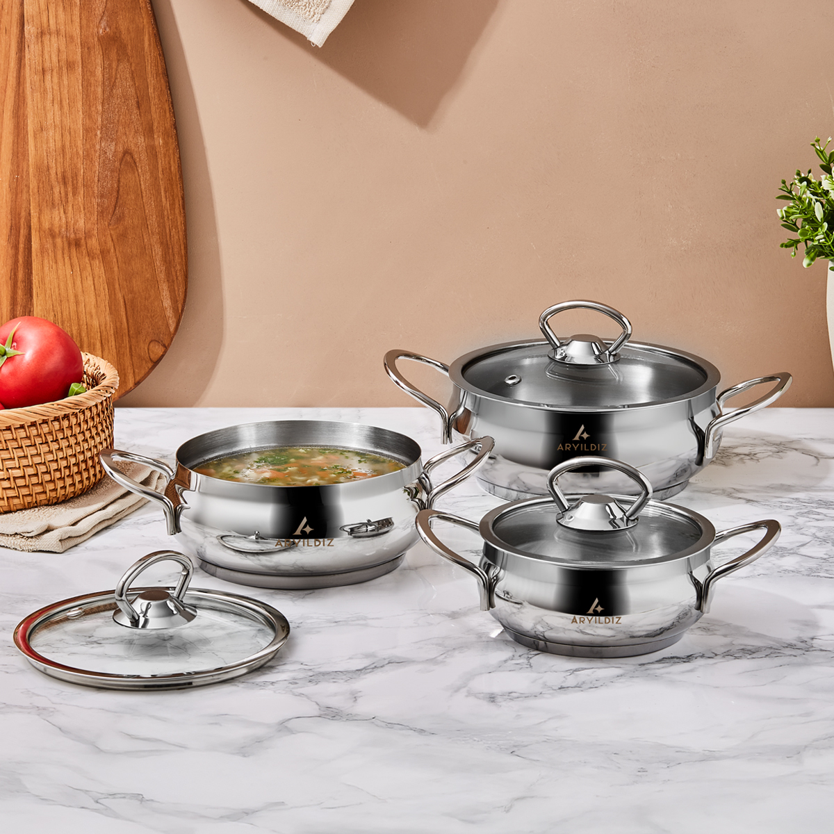 Gelince Haber VerAryıldız Olden Maxi Tencere Seti, paslanmaz çelikten imal edilmiştir. Hem elde hem bulaşık makinesinde yıkanma özelliğine sahiptir.