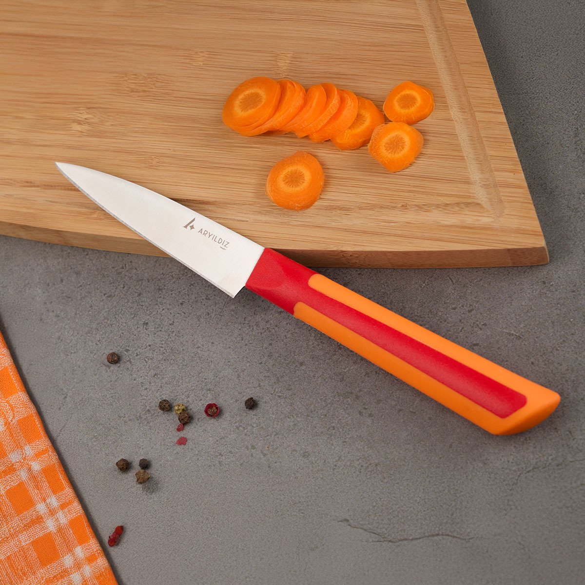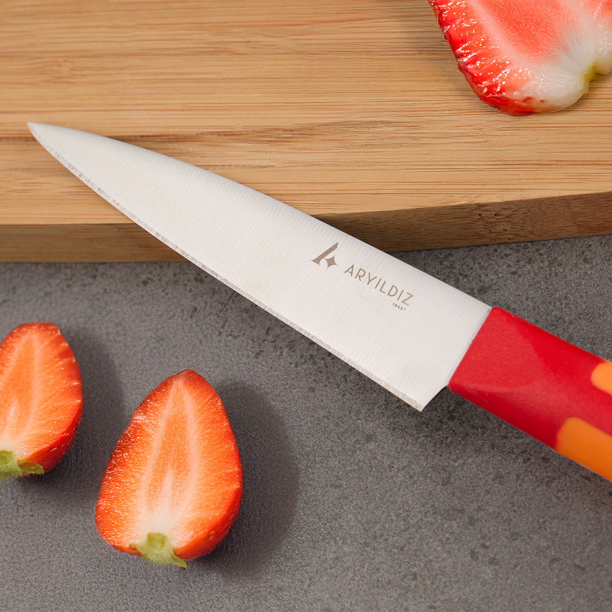 Canlı kırmızı rengiyle mutfağınıza ferah bir görünüm kazandıran PLUREX Çok Amaçlı Bıçak, günlük mutfak işlerinde hız ve kolaylık sağlar.