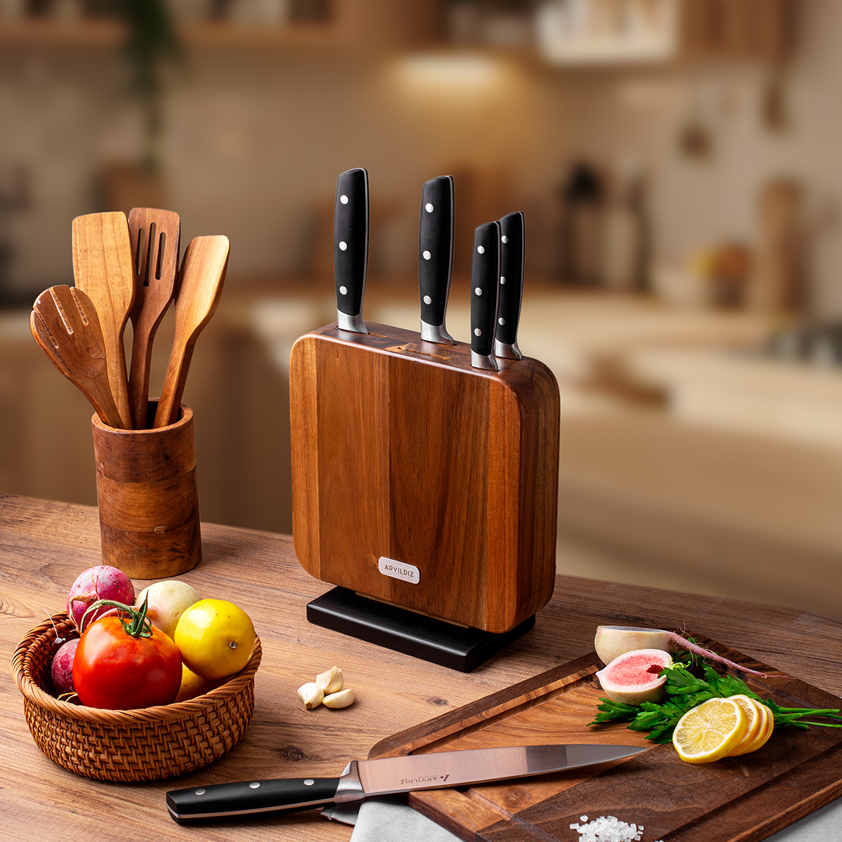 Pro-X Line blok bıçak seti, modern mutfaklar için yüksek performans sunan, dayanıklı ve ultra keskin bıçaklardan oluşur.