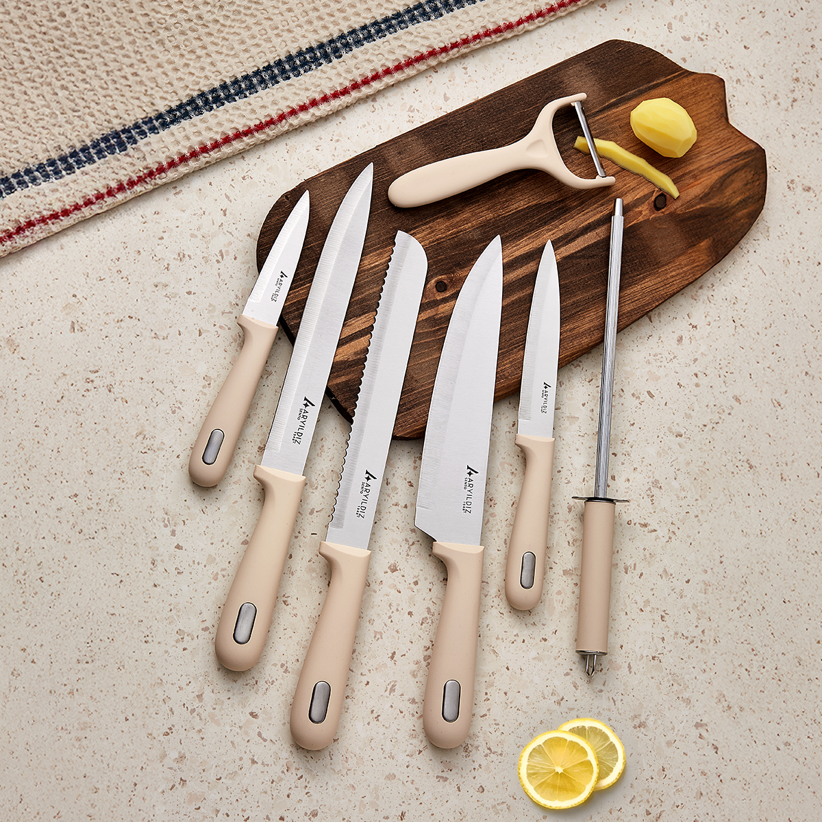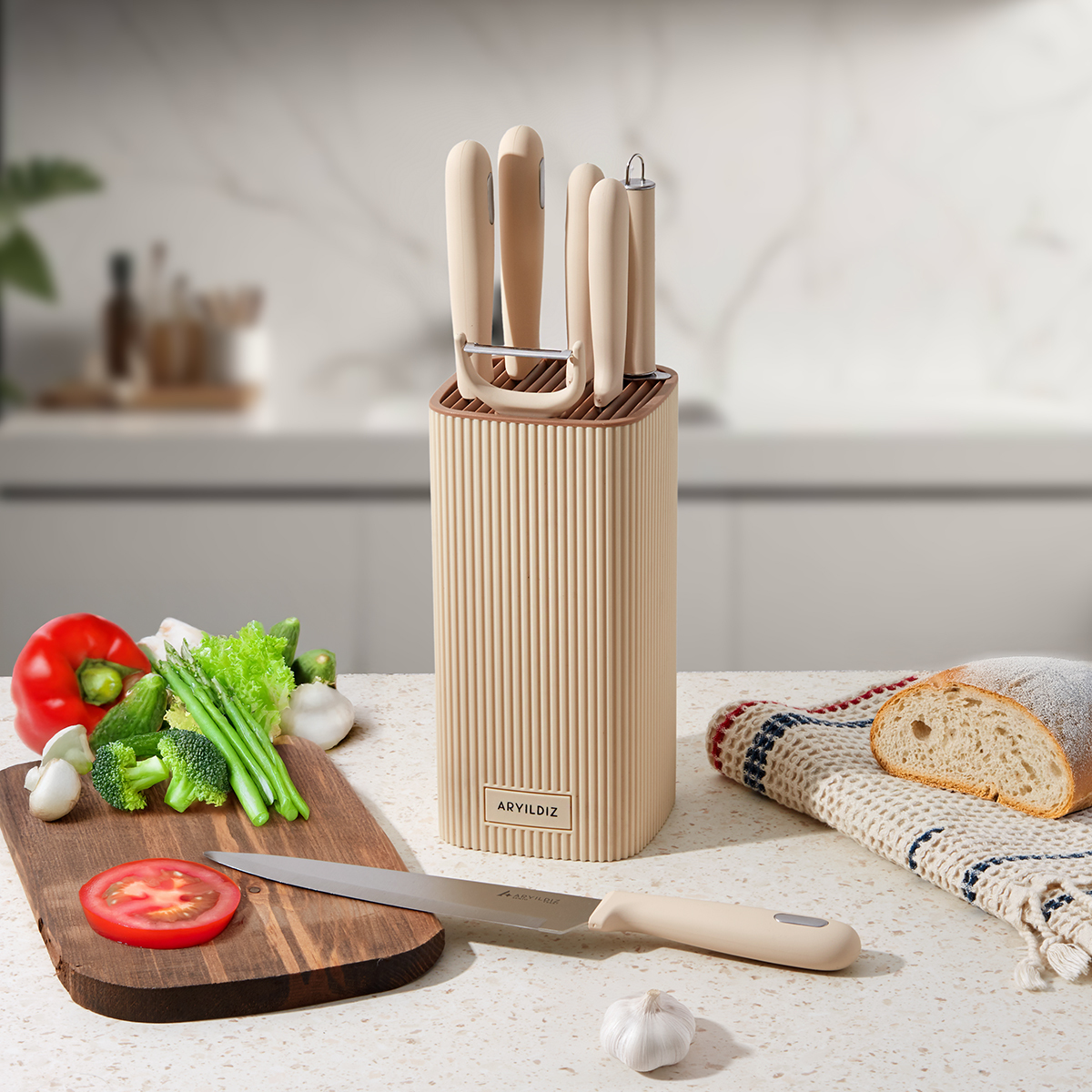 Günlük kullanımda ihtiyaç duyduğunuz tüm bıçak ve aksesuarları bir araya getiren bu set, yemek hazırlık sürecini daha pratik hale getirir.