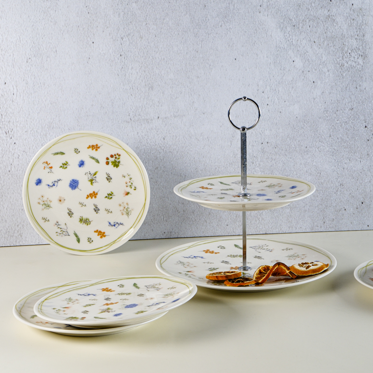 Gelince Haber VerSet içeriğinde bulunan katlu kurabiyelik ile tatlılarınızı sergileyebilir, 6 adet pasta tabağı ile misafirlerinize benzersiz sunumlar hazırlayabilirsiniz.