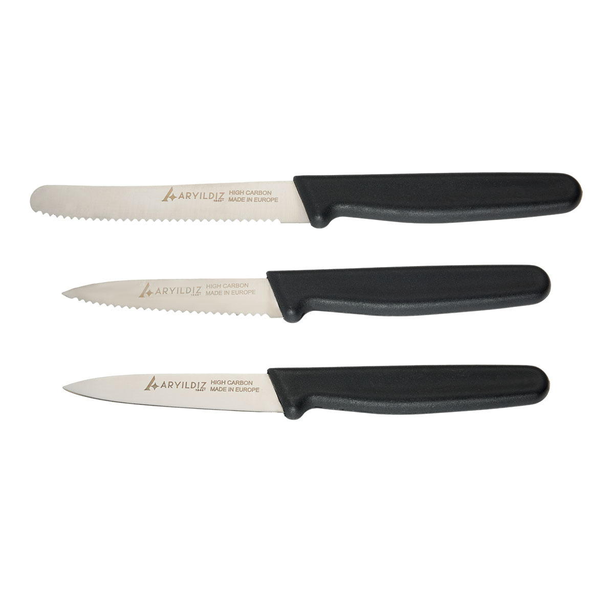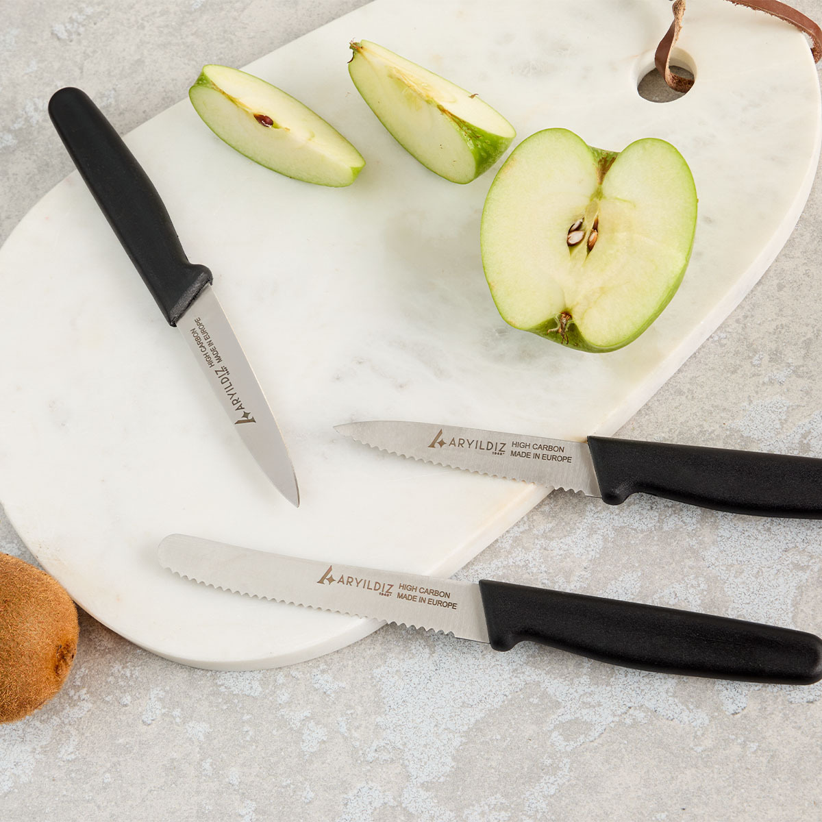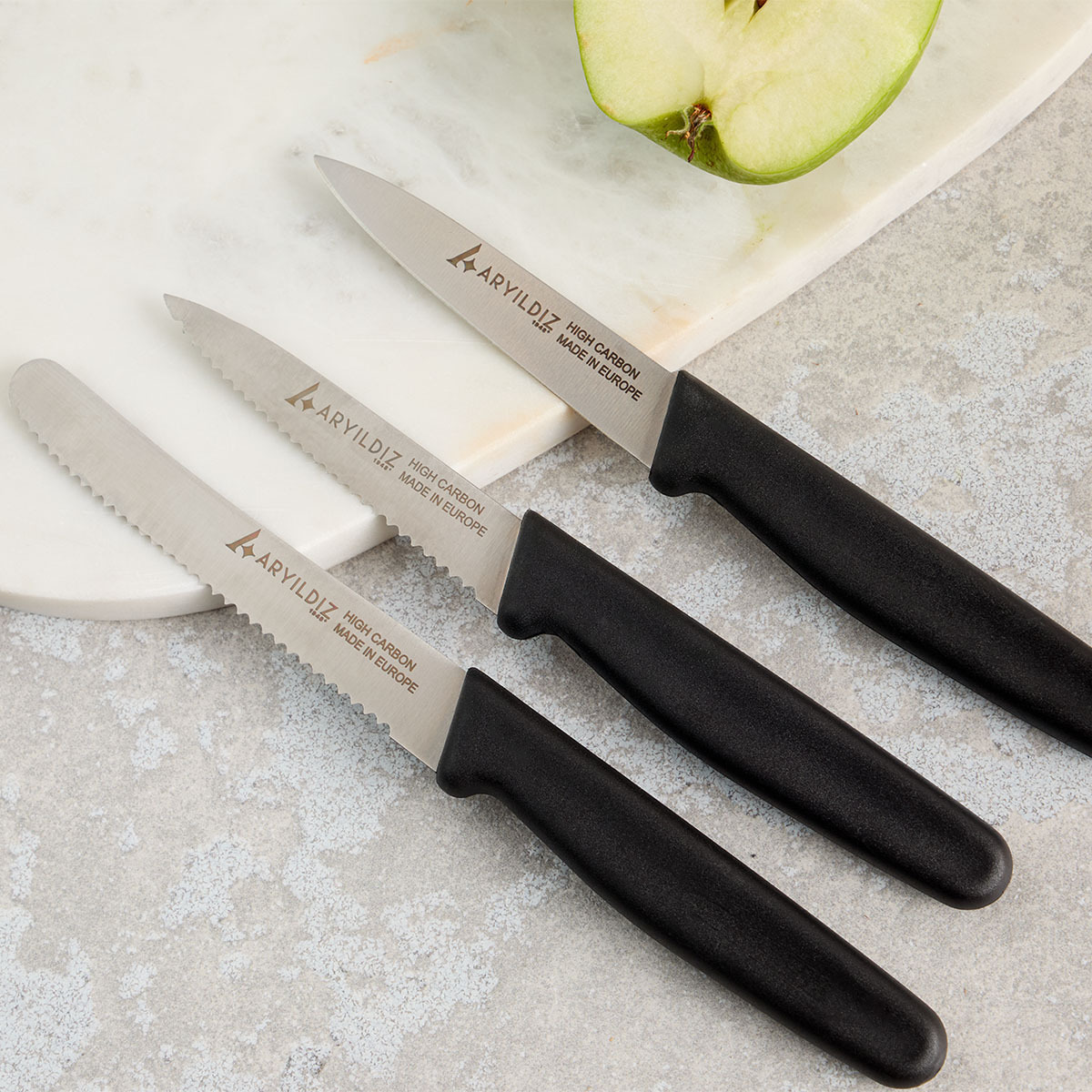 Set, farklı kullanım amaçlarına uygun üç özel bıçaktan oluşur.