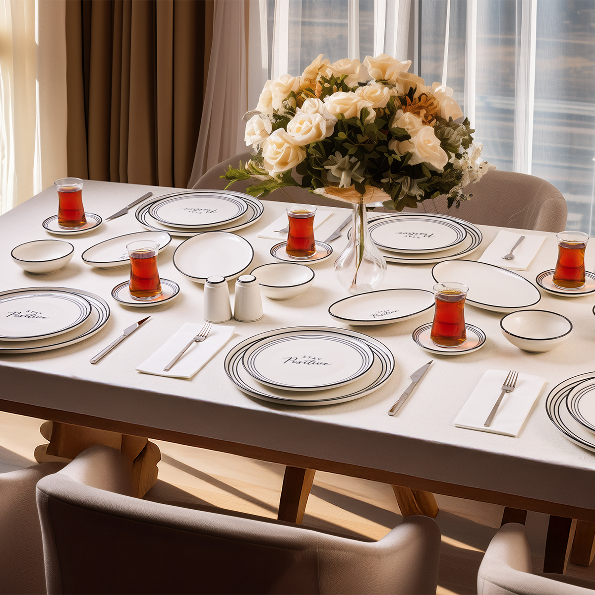 Yüksek kaliteli porselenden üretilen bu takım, uzun ömürlü kullanımın yanı sıra zarafetiyle de dikkat çeker. Göz alıcı beyaz zemin üzerine işlenmiş pozitif mesajlar ve sade detaylar, sofranıza sıcak ve samimi bir atmosfer kazandırır. Hem günlük kullanımlar hem de özel davetler için idealdir.