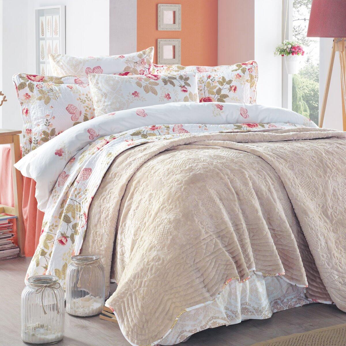 Çift taraflı bir yüzü %100 pamuk baskılı, diğer yüzü kadife nakışlı.