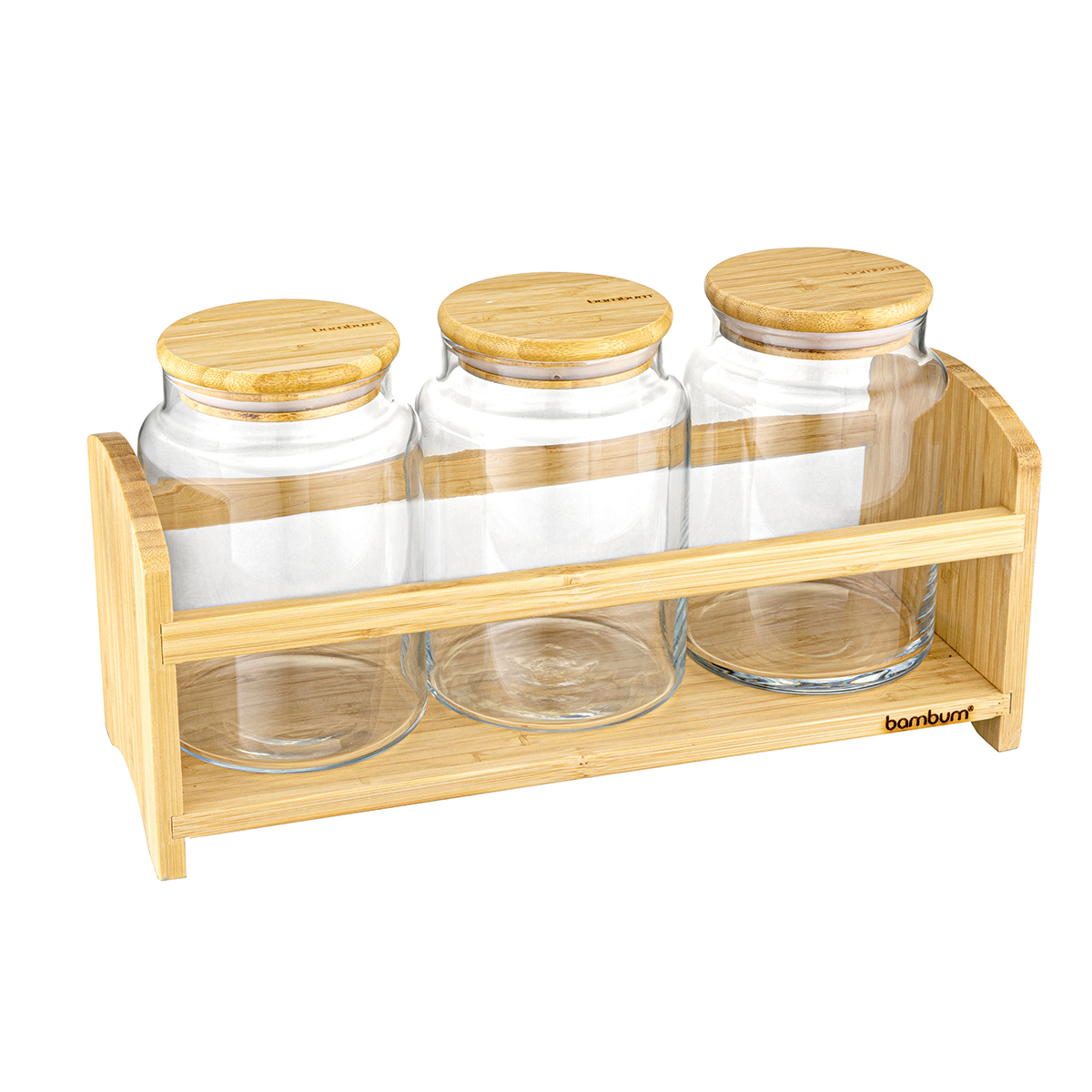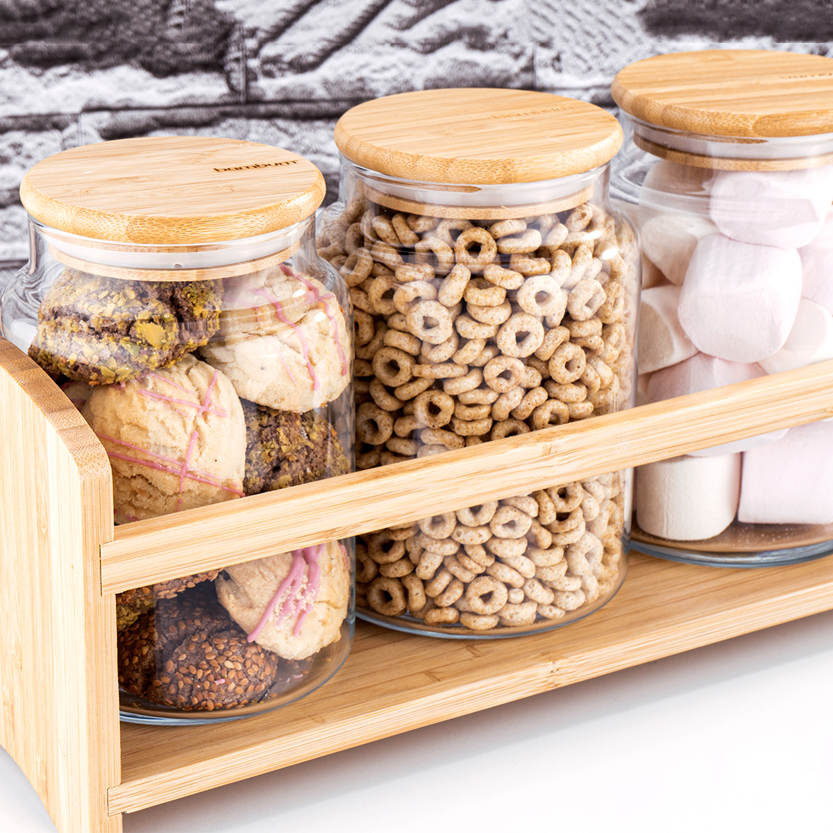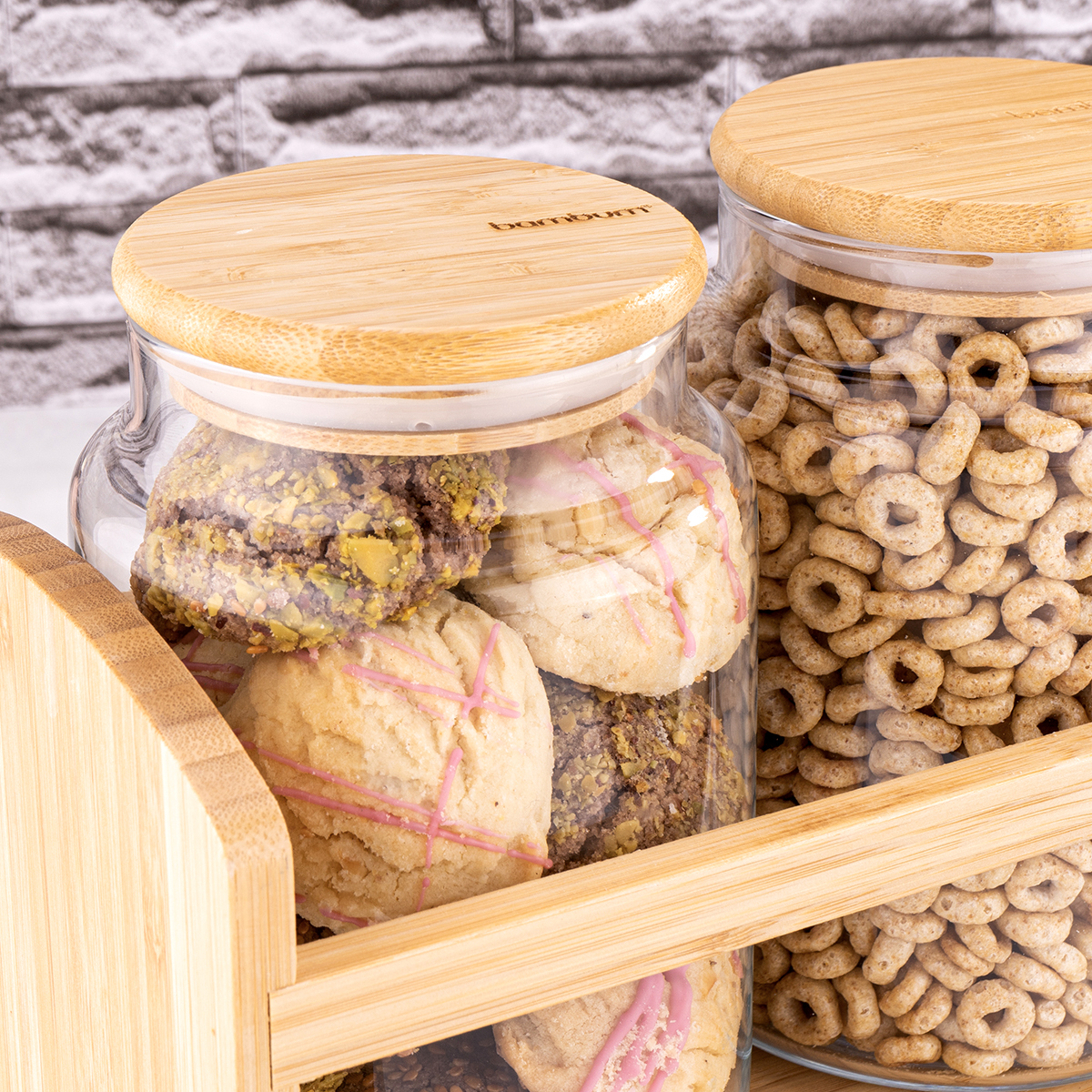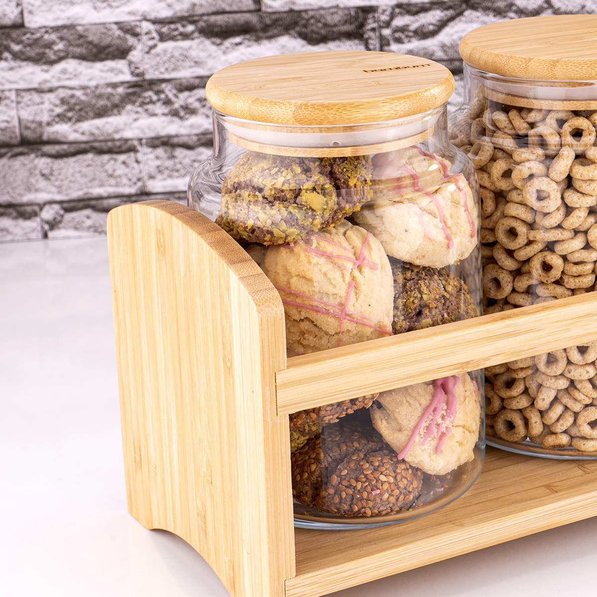 Vakumlu cam saklama kabı ve benzersiz tasarımlı bambu standıyla Bench tüm saklama