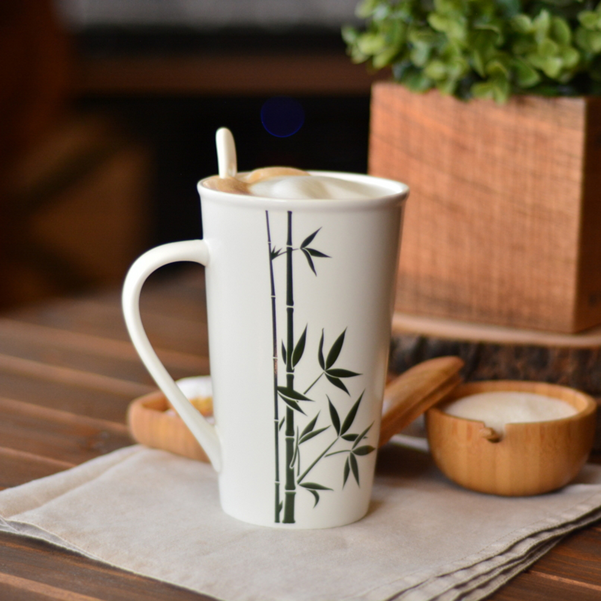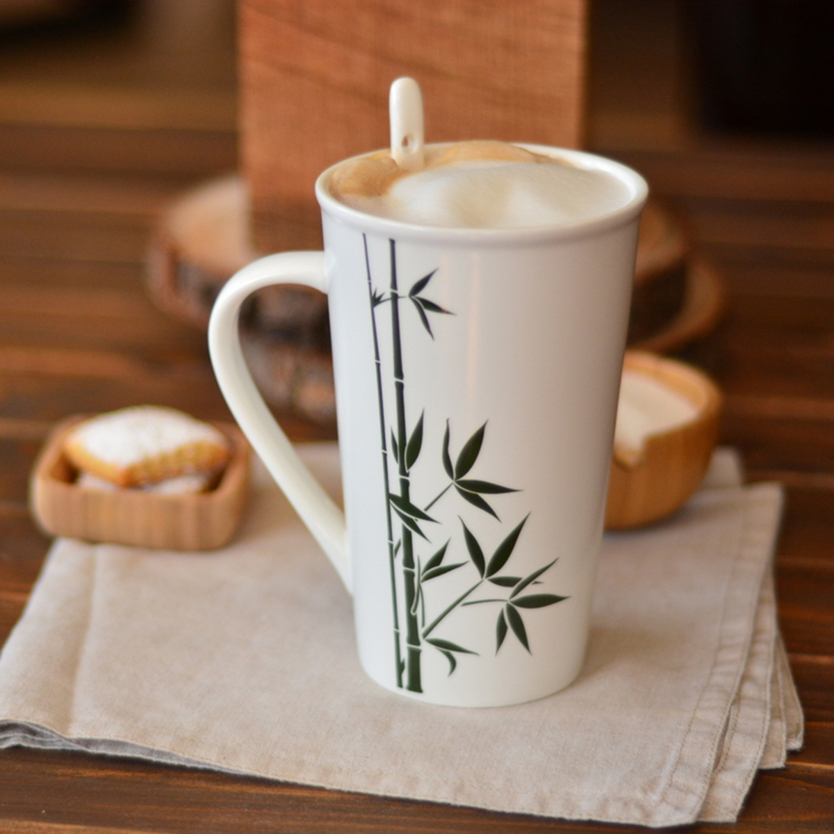 Bambu desenli porselen kupası ve şık porselen kaşığıyla Cop, dilerseniz latte, dilerseniz milk shake sunumlarınıza can verecek.