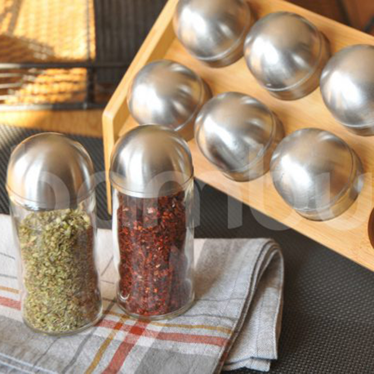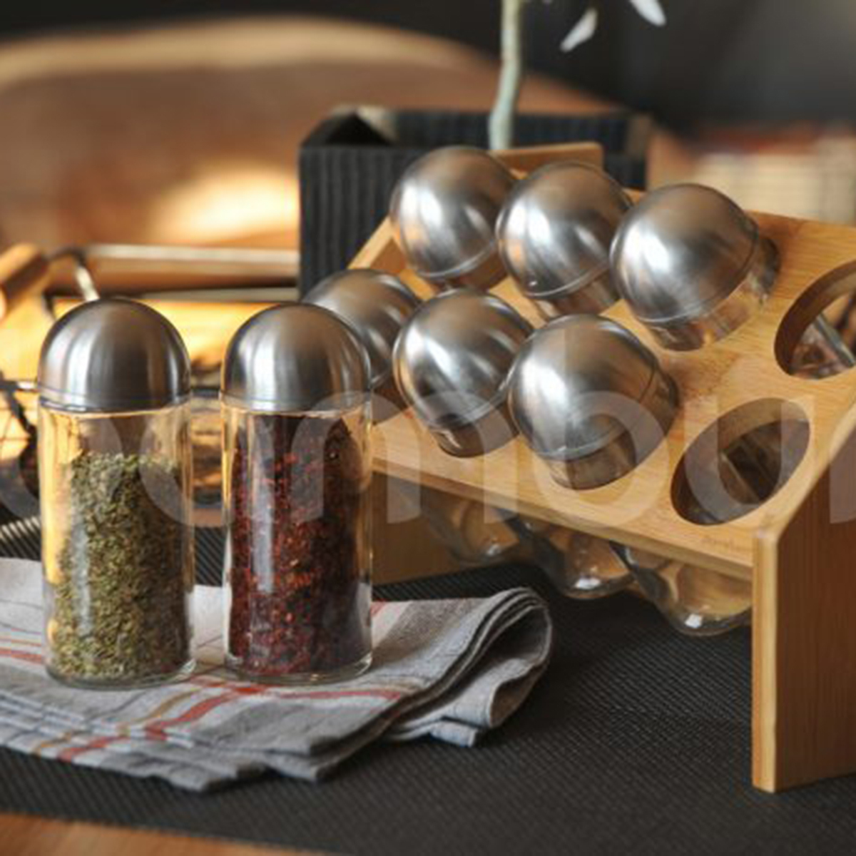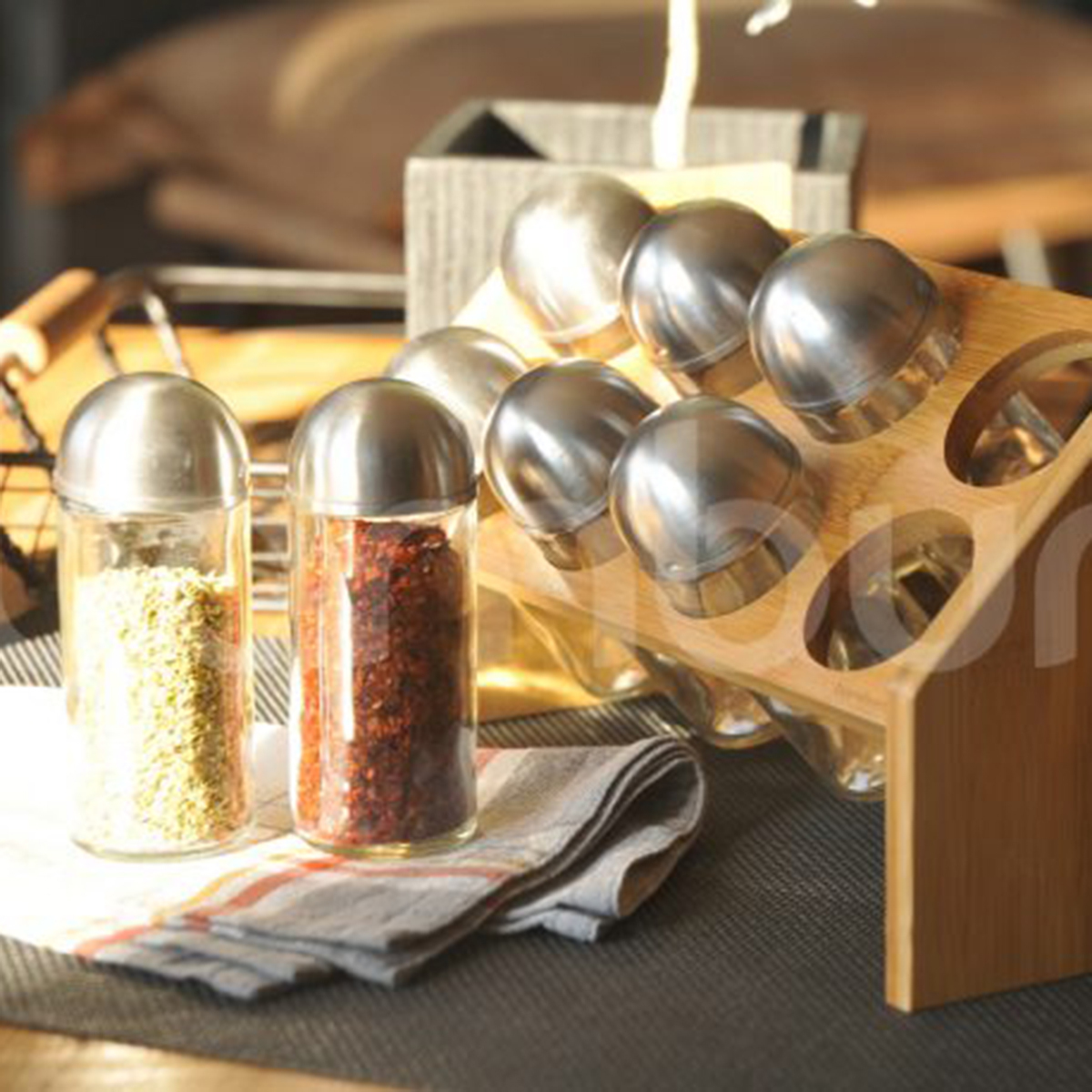 Bambum Diana 8’li Baharatlık, yatay yapısı, bambu gövdesi ve 8 adet çelik kapaklı cam şişesi ile mutfağınızın vazgeçilmezi olacak.