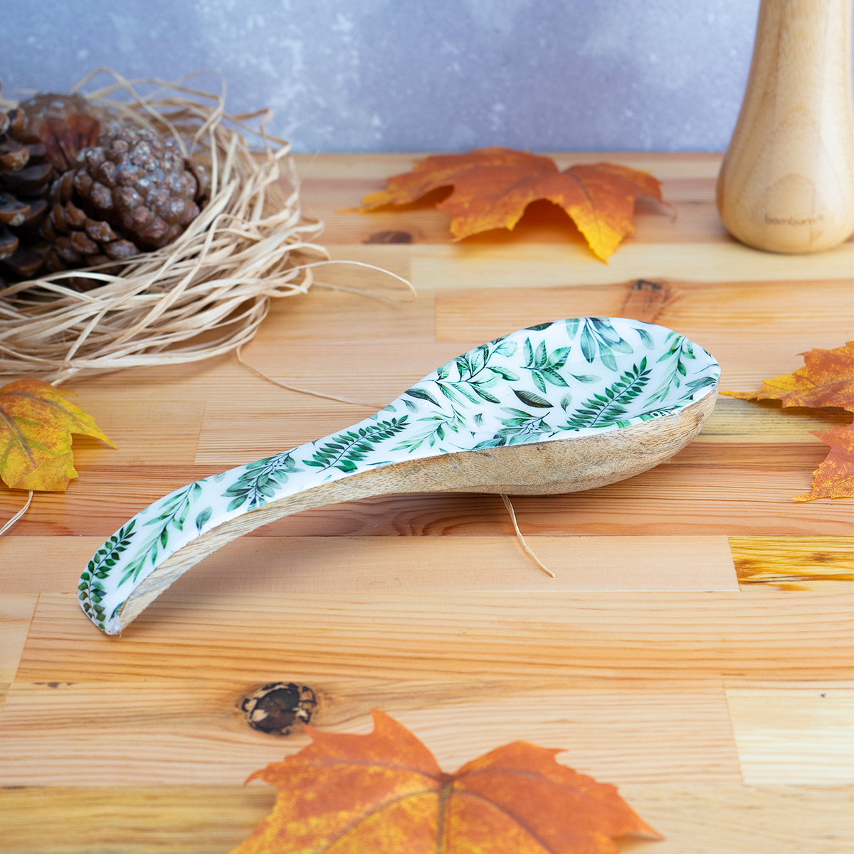 Gelince Haber VerDoğadan ilham alan yaprak desenleriyle mutfağa ferah bir hava katan Bambum Kagura Kaşık Altlığı, yemek hazırlığı sırasında kullanılan kaşık, kepçe ve spatulalar için pratik ve hijyenik bir çözüm sunar. Tezgâhın temiz kalmasına yardımcı olurken estetik görünümüyle de dikkat çeker.