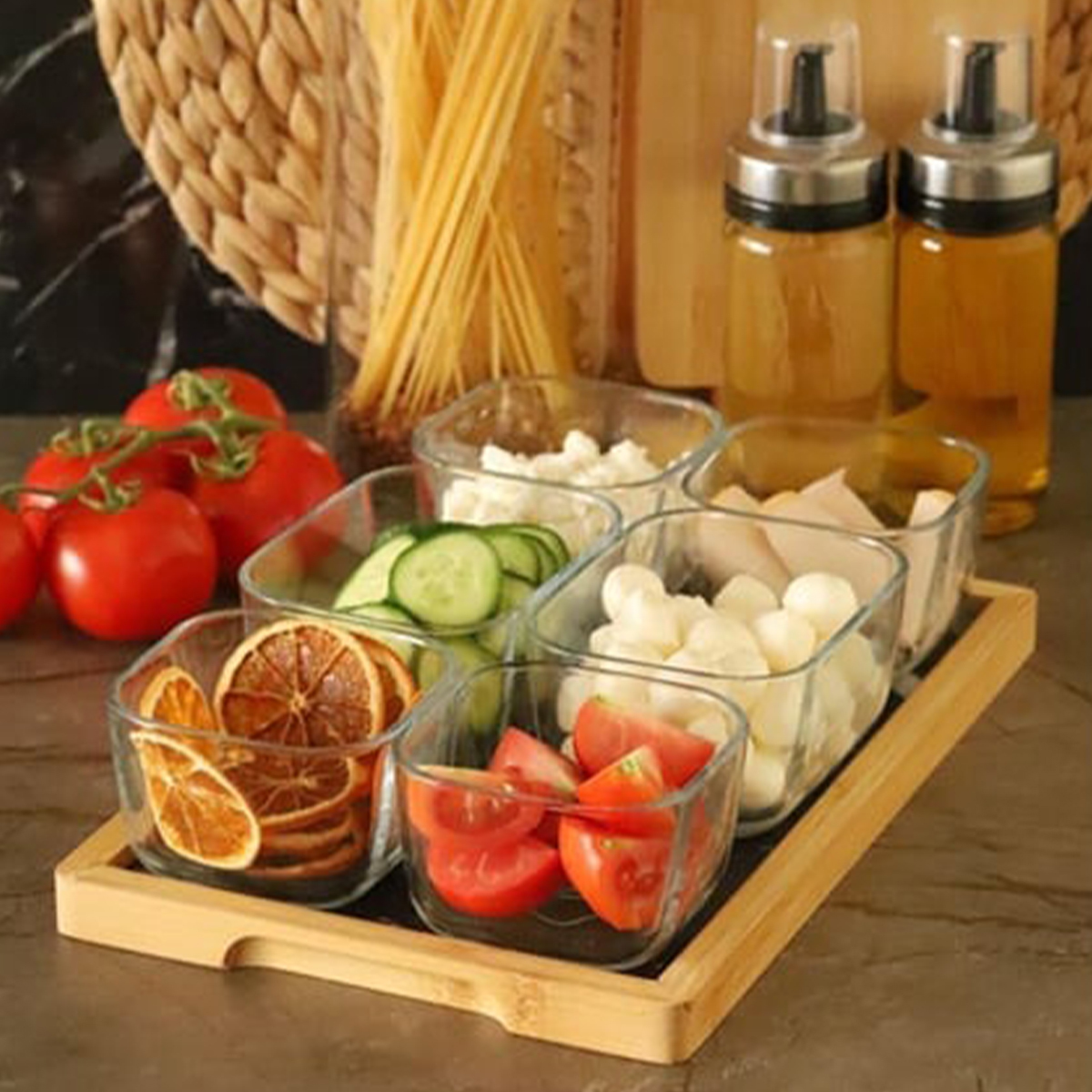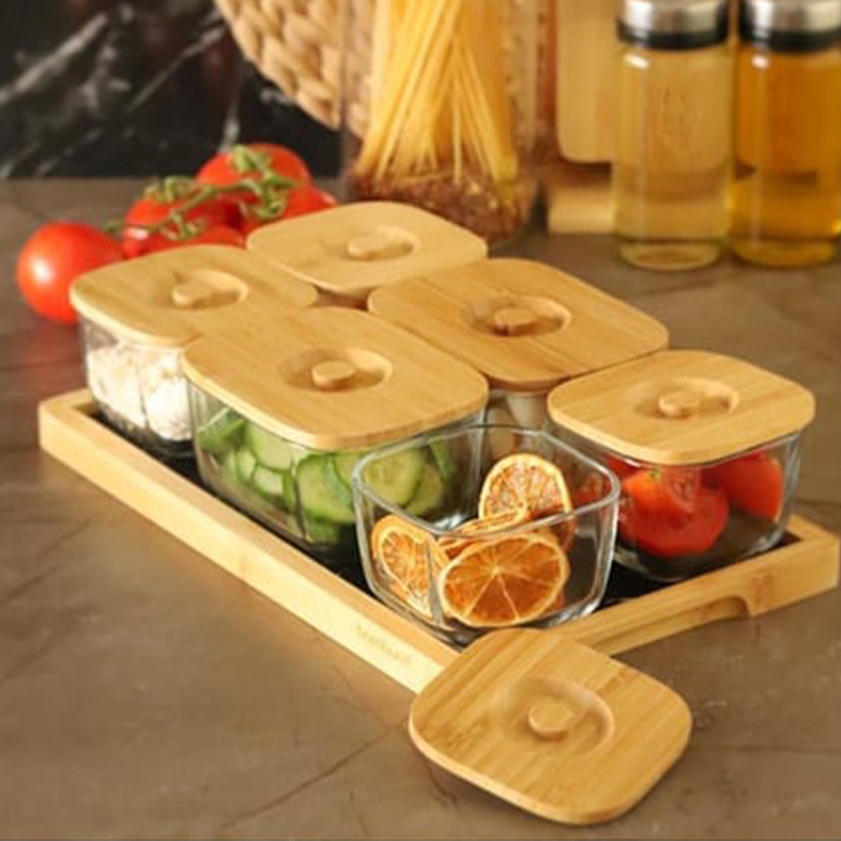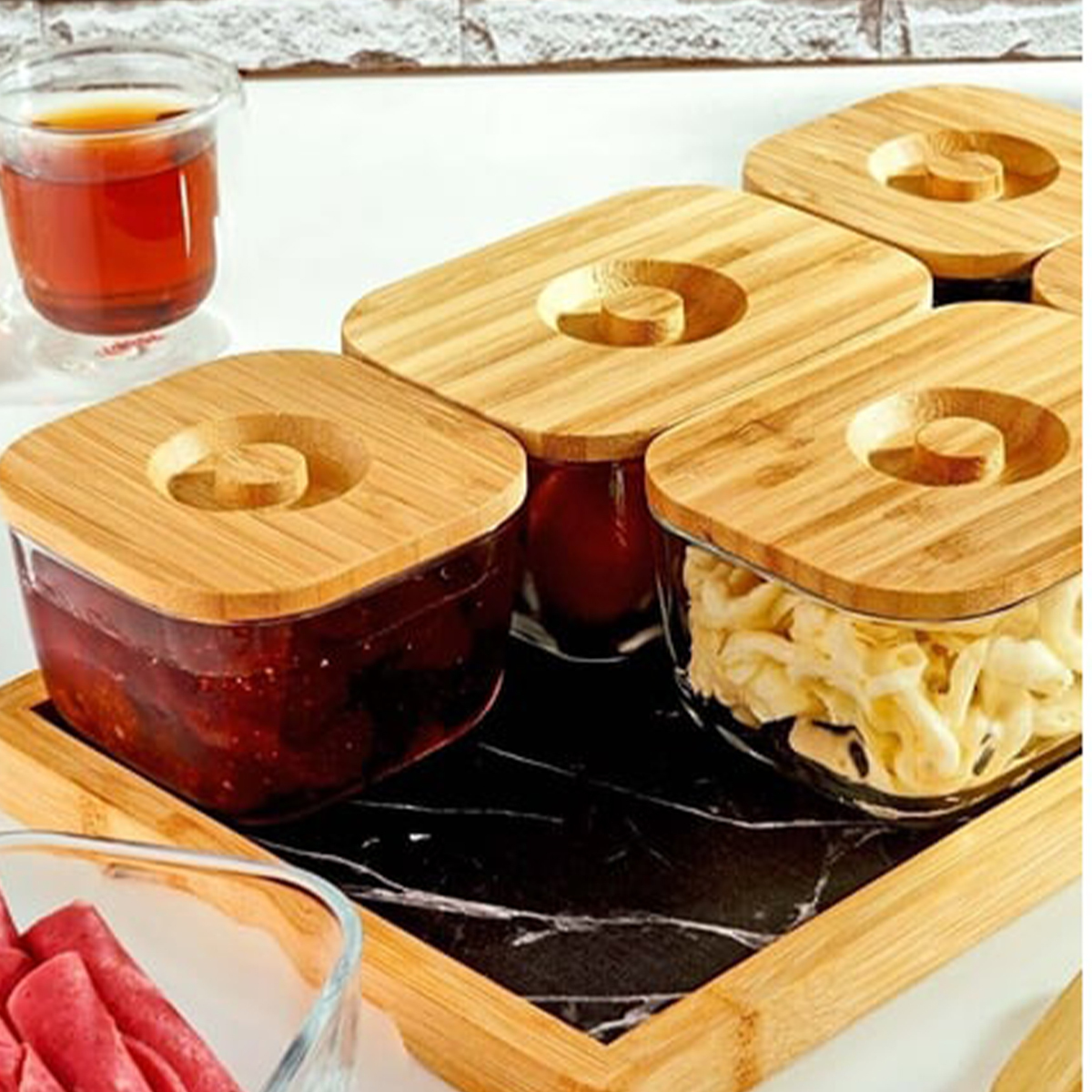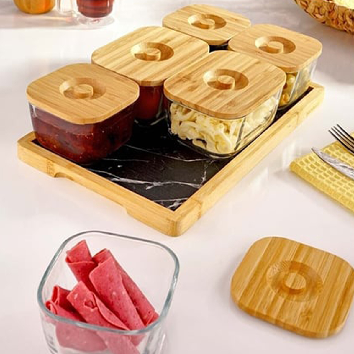 Altı adet bambu kapaklı cam kase ve bunları bir arada tutan bambu tepsisiyle Krosna, hem kahvaltı sunumlarınız için hem de kahvaltılıklarınızı saklamak için her zaman elinizin altında olacak.