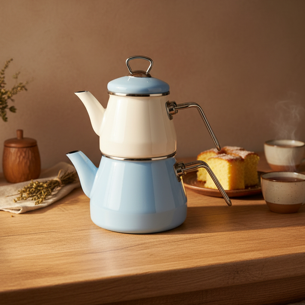 Yüksek kaliteli emaye malzeme ile üretilmiş olan bu çaydanlık takımı, uzun ömürlü kullanım sunar ve günlük çay keyfinizi pratik hale getirir. Emaye yüzeyi, ısıyı dengeli dağıtarak çayın ideal şekilde demlenmesini sağlar. Ayrıca pürüzsüz ve kolay temizlenebilir yüzeyi sayesinde hijyenik bir kullanım sunar.