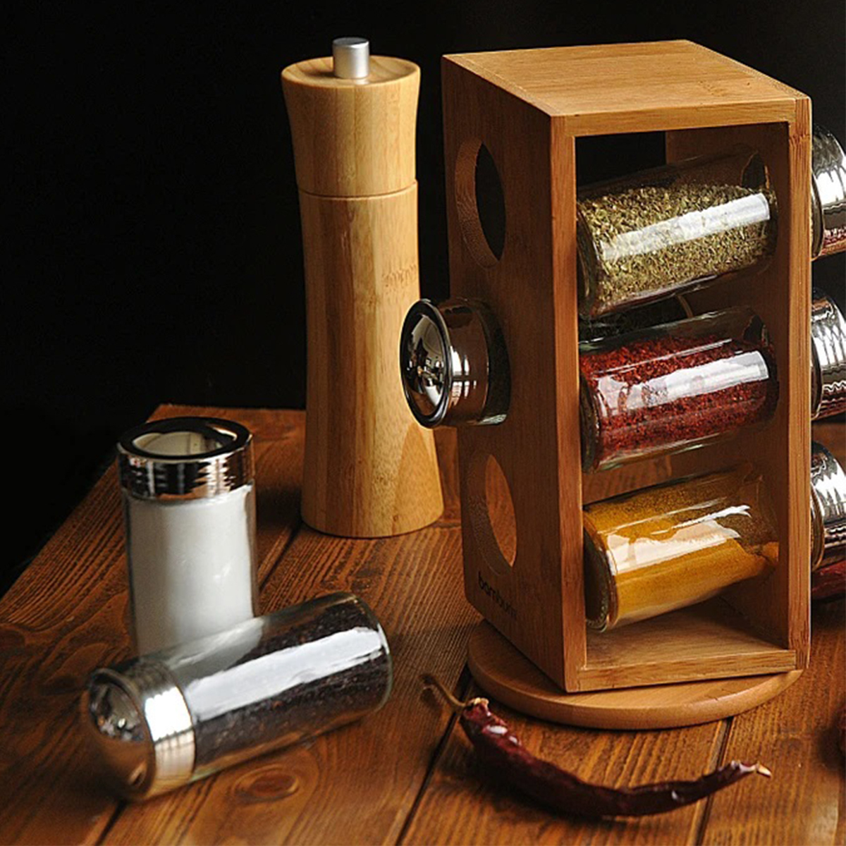 Gelince Haber VerBambum Tina 6'lı Dönen Baharatlık bambum Tina Baharatlık, 360 derece dönebilen mekanizması, bambu gövdesi ve 6 adet cam şişesi ile mutfağınızın vazgeçilmezi olacak.