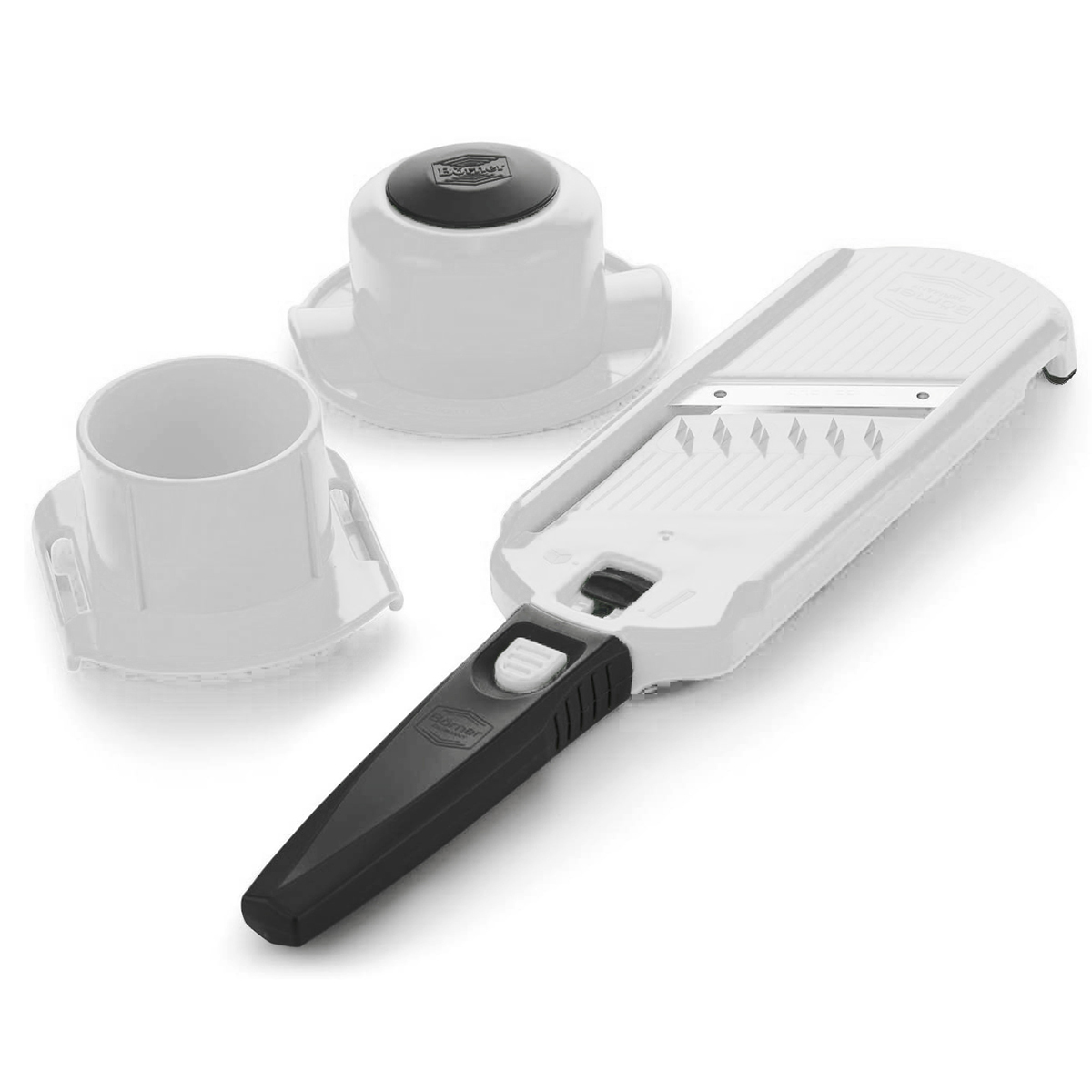 • Bir sonraki işlev onu heyecan verici hale getirir: nihayet yemekleri bir sonraki seviyeye taşımak için mükemmel küpleri kesmek. Bunu yapmak için, birlikte verilen rayı dicer üzerine yerleştirin, sebzeleri yerleştirin ve mini meyve tutucuyu üstüne koyun. Her aşağı doğru kesme hareketinden sonra, yerine oturduğunu fark edene kadar meyve tutucuyu 90 ° çevirin. Bu şekilde, dicer'ın kenarları tamamen aynı boyutta olacaktır. Ve bununla ilgili en iyi şey: Eliniz, kesme işlemi sırasında güvenlik meyve tutucunuz tarafından mükemmel bir şekilde korunmaktadır! Bu, en küçük sebzeleri bile güvenli bir şekilde zar atmanızı sağlar.