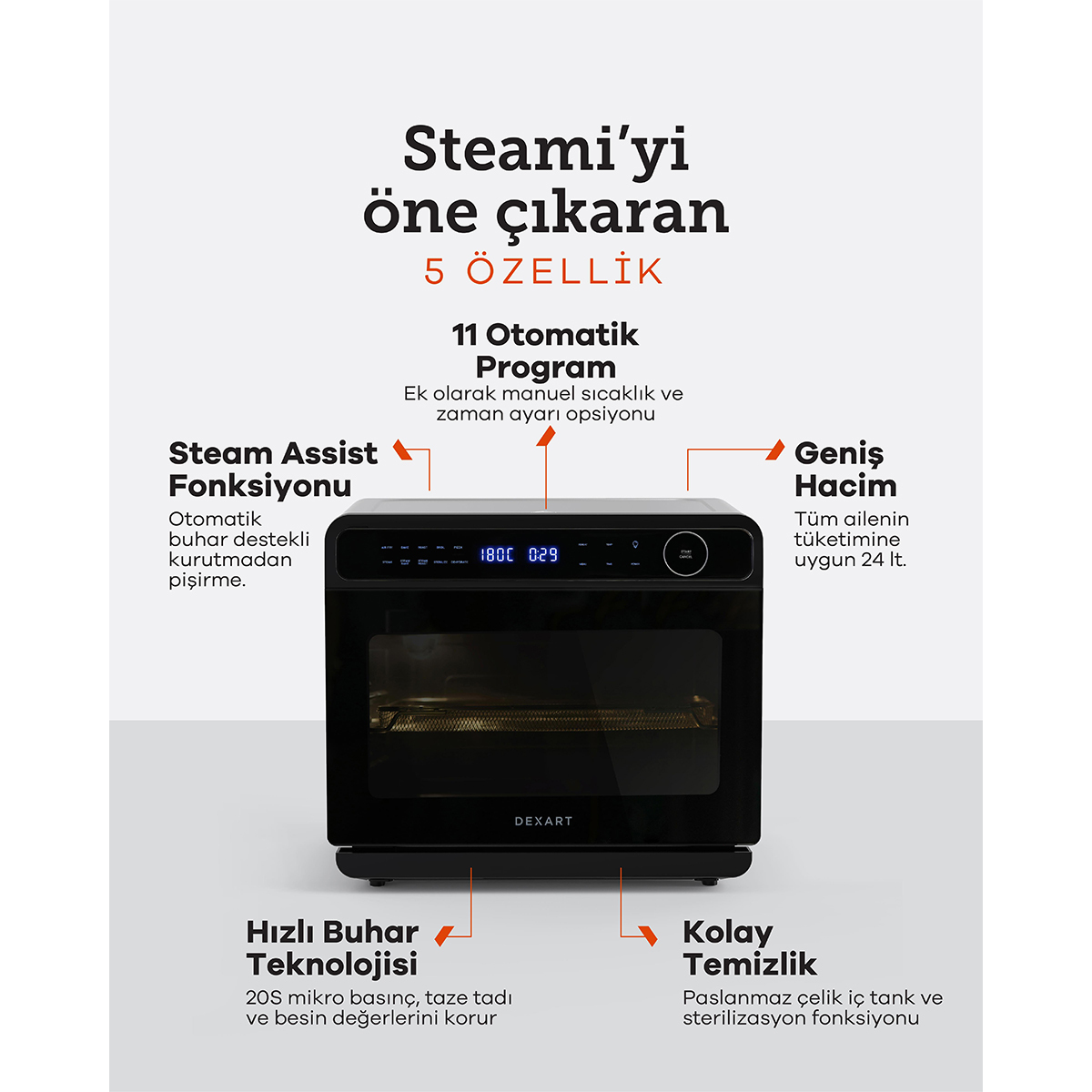 24 litrelik geniş hacim: Büyük porsiyonlar veya birden fazla yemeği aynı anda pişirebilme imkanı.