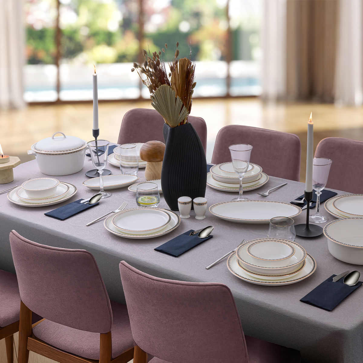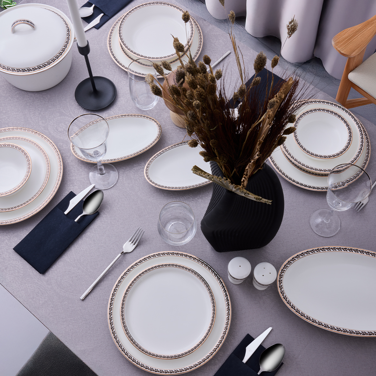 Toplam 60 parçadan oluşan bu set, 12 kişilik eksiksiz bir yemek deneyimi sunar. Servis tabaklarından çorba kaselerine, salata kasesinden oval sunum tabaklarına kadar her bir parça, sofranızı kusursuz hale getirecek şekilde özenle tasarlanmıştır.