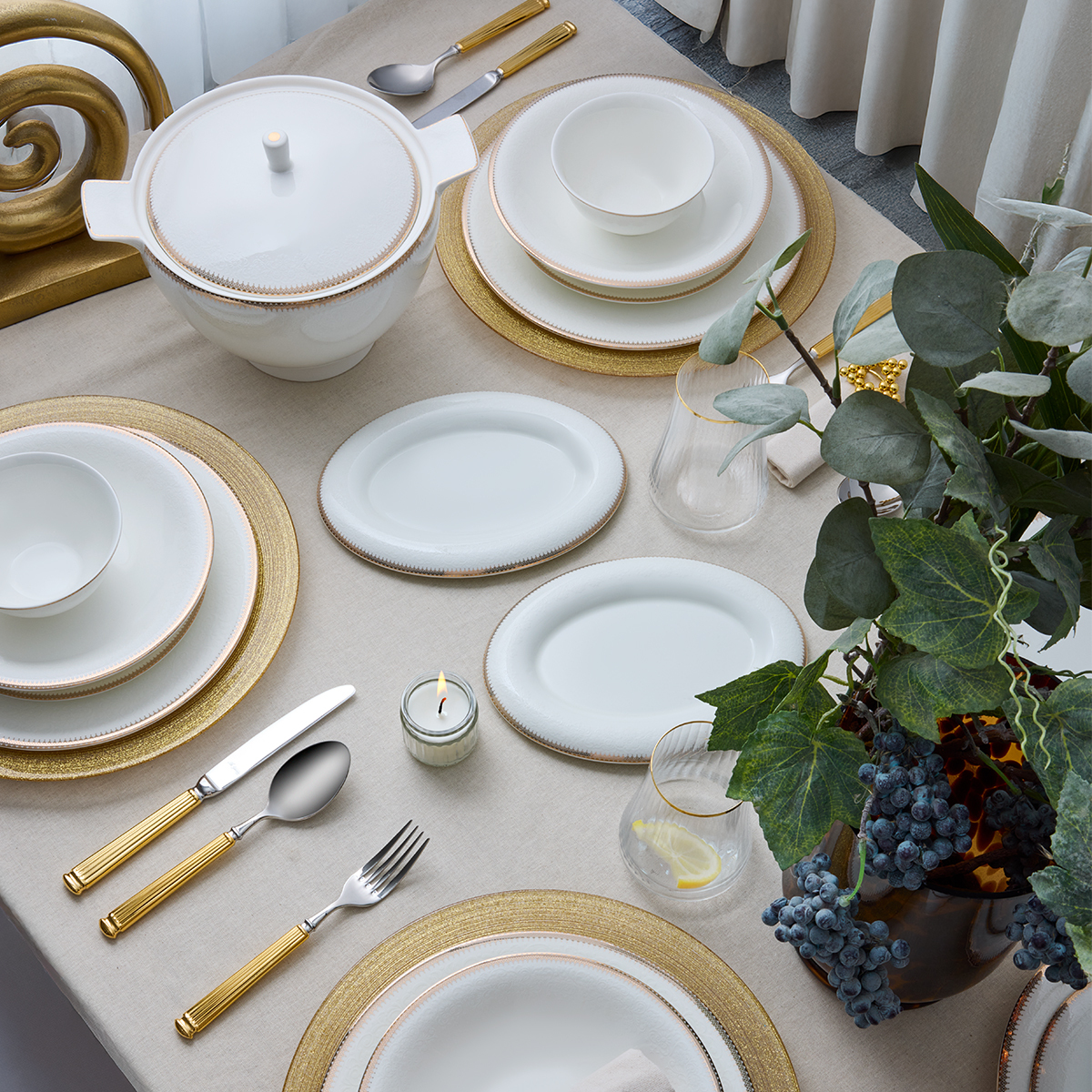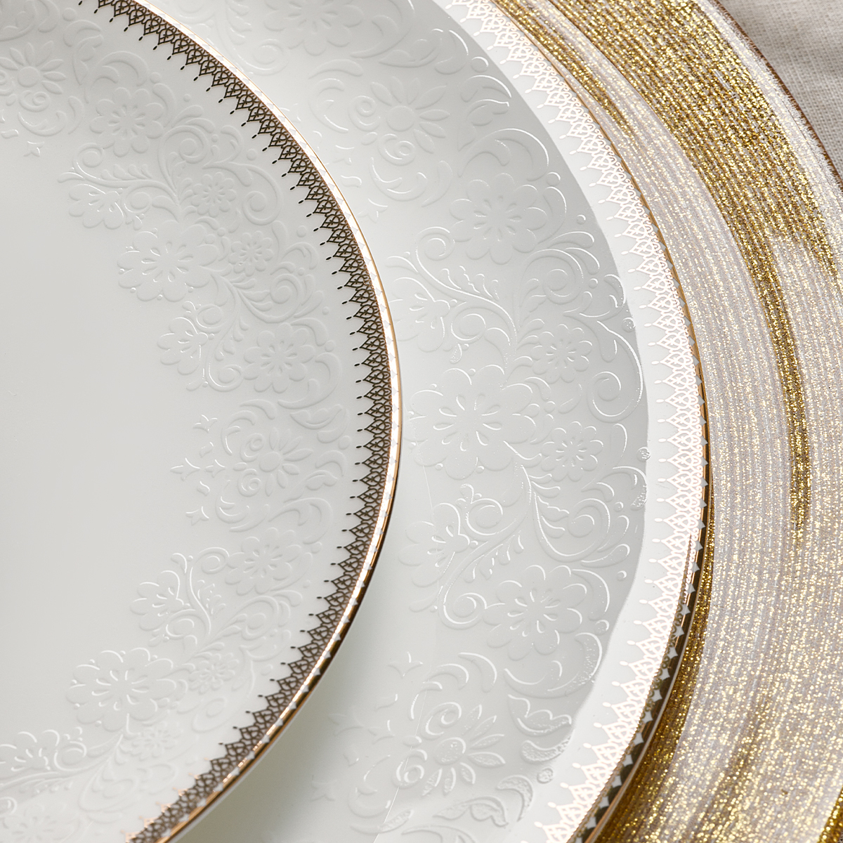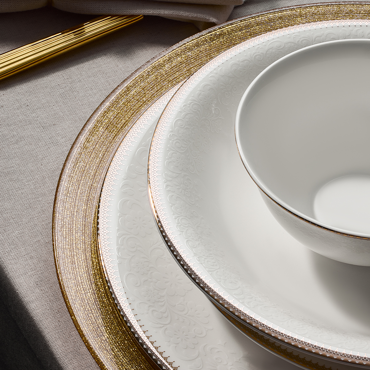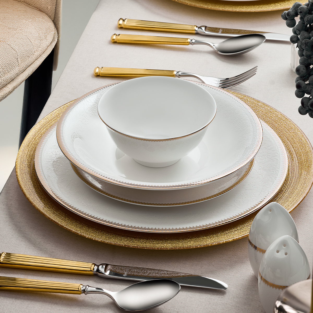 Altın detaylarıyla zenginleştirilmiş tasarımı, misafirlerinize şık ve gösterişli bir sofra deneyimi sunar.