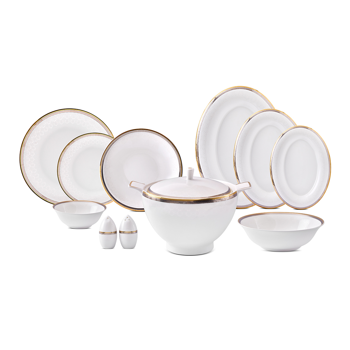 İnce işlenmiş bordürleri, parlak porselen yüzeyi ve sofistike hatlarıyla ihtişamını sofranıza taşır.