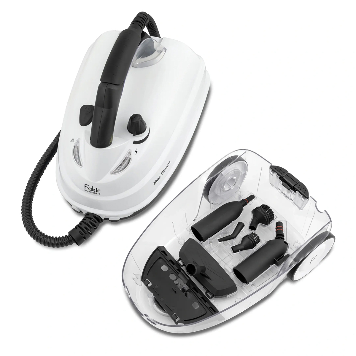 Aksesuarlar: Cam temizleme aparatı, büyük yuvarlak fırça, küçük yuvarlak fırça, köşe aparatı, zemin başlığı aparatı, uzatma boruları, uzatma aparatı, mikrofiber bez, huni, ölçü kabı