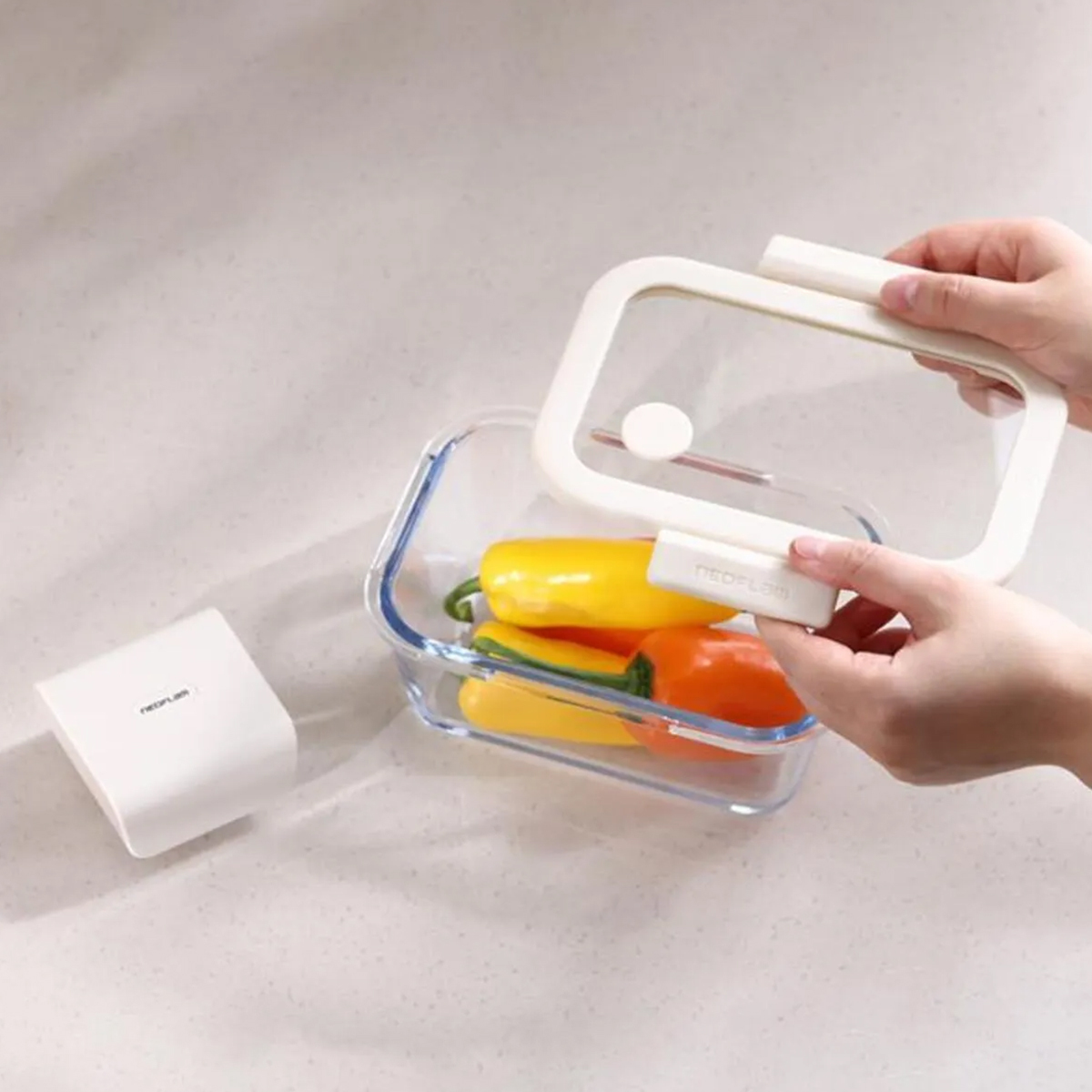 Vakumlanan saklama kabı, klipsleri açıldığında kapaktan ayrılmaz.