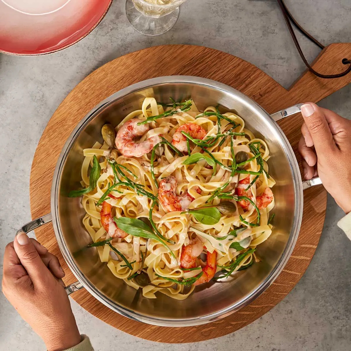 Sıvıların kolay, hassas ve akmadan dökülmesi ve aktarılması için yuvarlak şekilli ve ekstra geniş dökme ağızlı sağlam 18/10 paslanmaz çelikten yapılmış Fissler Premium tava gövdesi