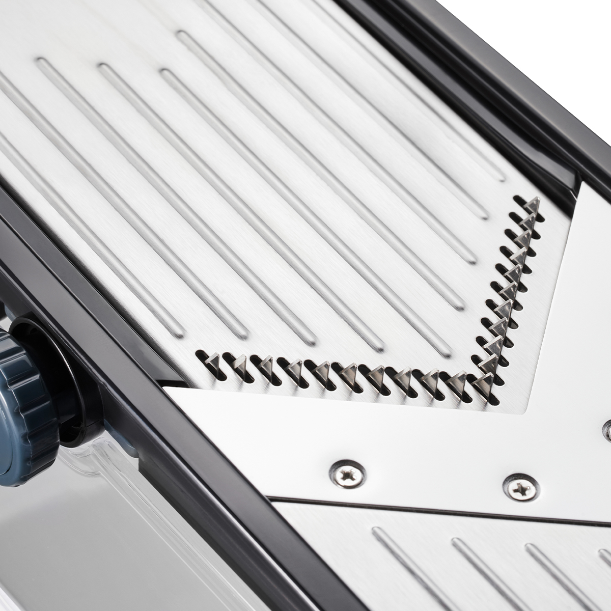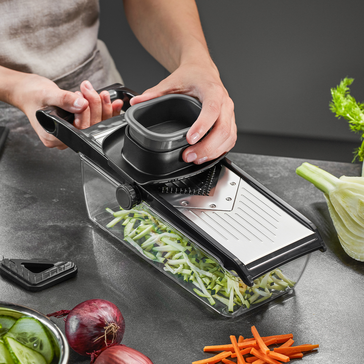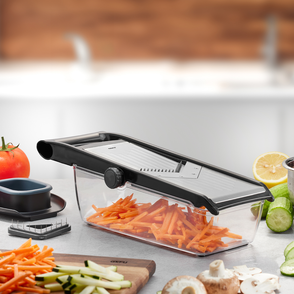 Gelince Haber VerCollect sebze dilimleyici, meyve ve sebze dilimleri için 5 ayarlanabilir kesme kalınlığına ek olarak, eşit jülyen şeritler için iki ek bıçak ucu sunar.